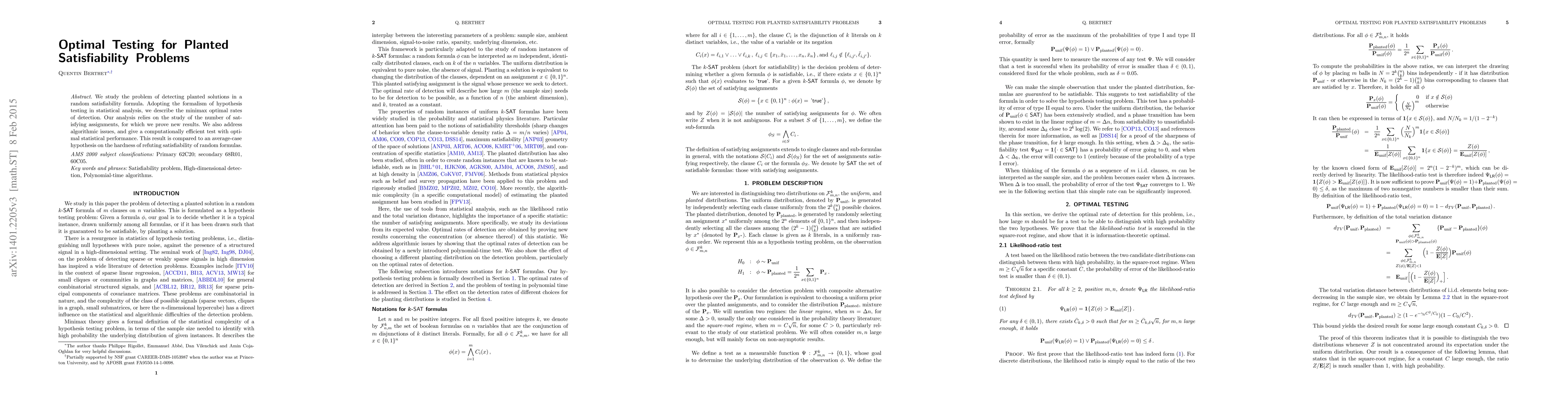 We study the problem of detecting planted solutions in a random satisfiability formula. Adopting the formalism of hypothesis testing in statistical analysis, we describe the minimax optimal rates of detection. Our analysis relies on the study of the number of satisfying assignments, for which we prove new results. We also address algorithmic issues, and give a computationally efficient test with optimal statistical performance. This result is compared to an average-case hypothesis on the hardness of refuting satisfiability of random formulas.