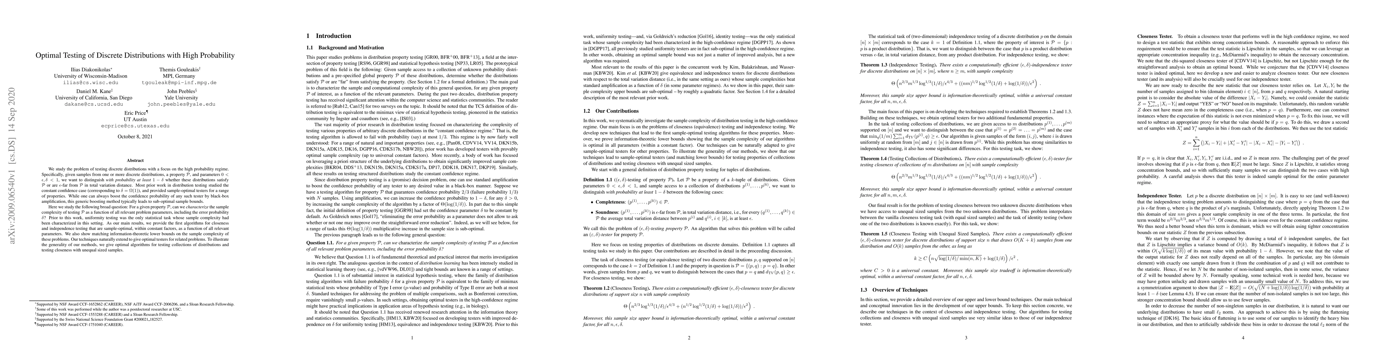 This paper presents optimal algorithms for testing properties of discrete distributions with high probability, achieving sample complexity that is characterized as a function of error probabilities and other relevant parameters. It provides sample-optimal testers for closeness and independence testing, supported by matching information-theoretic lower bounds.