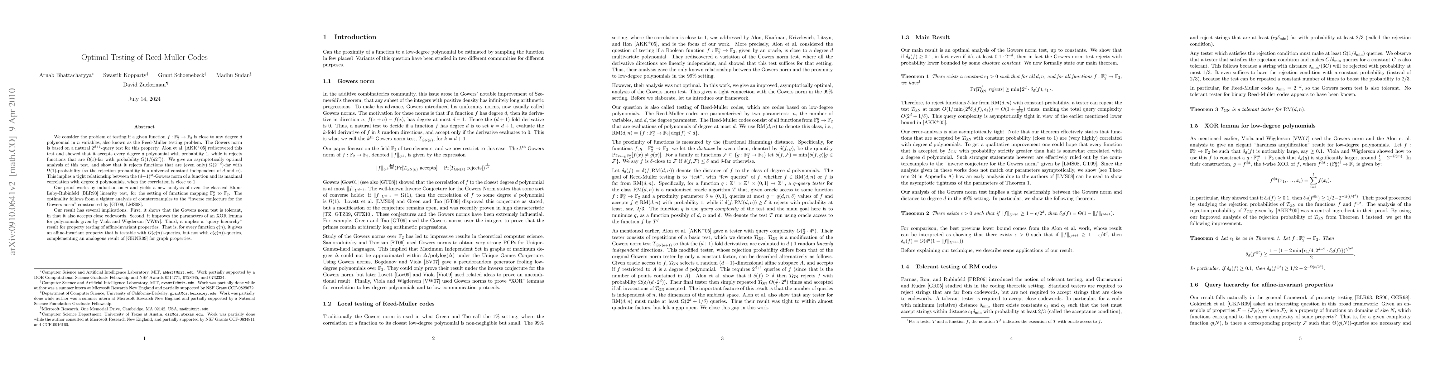 The paper analyzes the optimal testing of Reed-Muller codes, showing that a 2^{d+1}-query test can reject functions that are Omega(2^{-d})-far with probability Omega(1)-probability, improving previous results and implications for property testing.