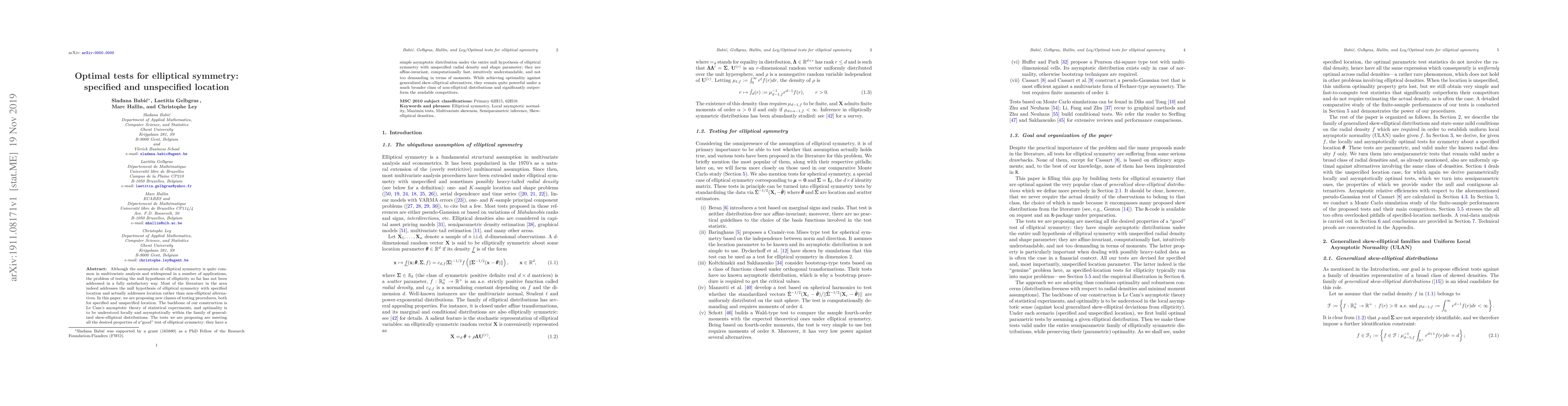 This paper proposes new testing procedures for elliptical symmetry in multivariate data, addressing both specified and unspecified location. Utilizing Le Cam's asymptotic theory, the proposed tests are optimal, computationally efficient, and powerful against a wide range of non-elliptical alternatives.