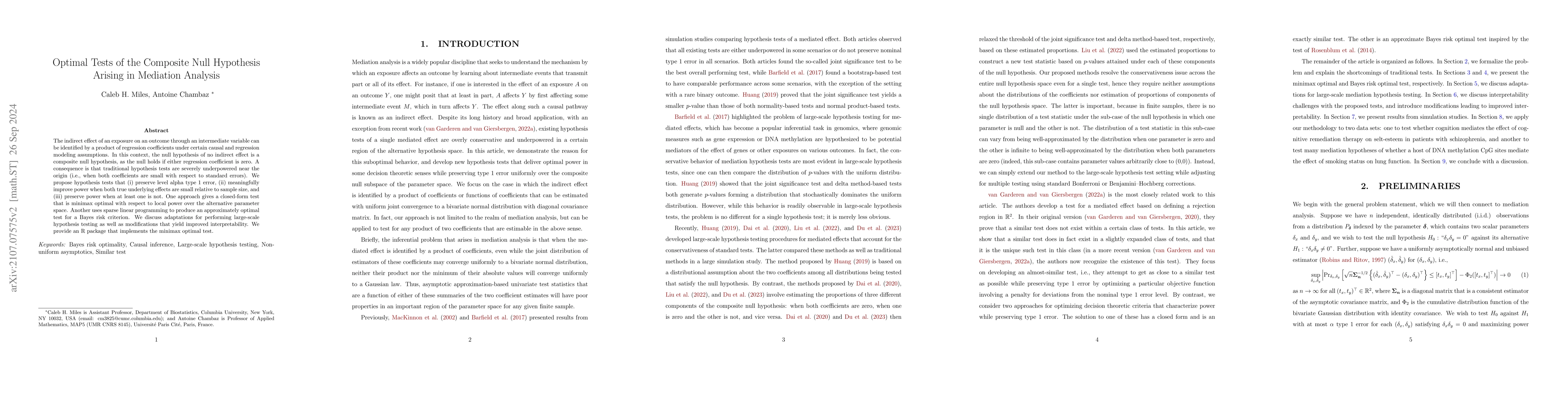 This paper proposes improved hypothesis tests for the composite null hypothesis of no indirect effect in mediation analysis, addressing issues with existing tests. The new tests preserve type 1 error, enhance power for small effects, and offer both a minimax optimal closed-form test and a Bayes risk-based sparse linear programming test. An R package is provided for the minimax optimal test.