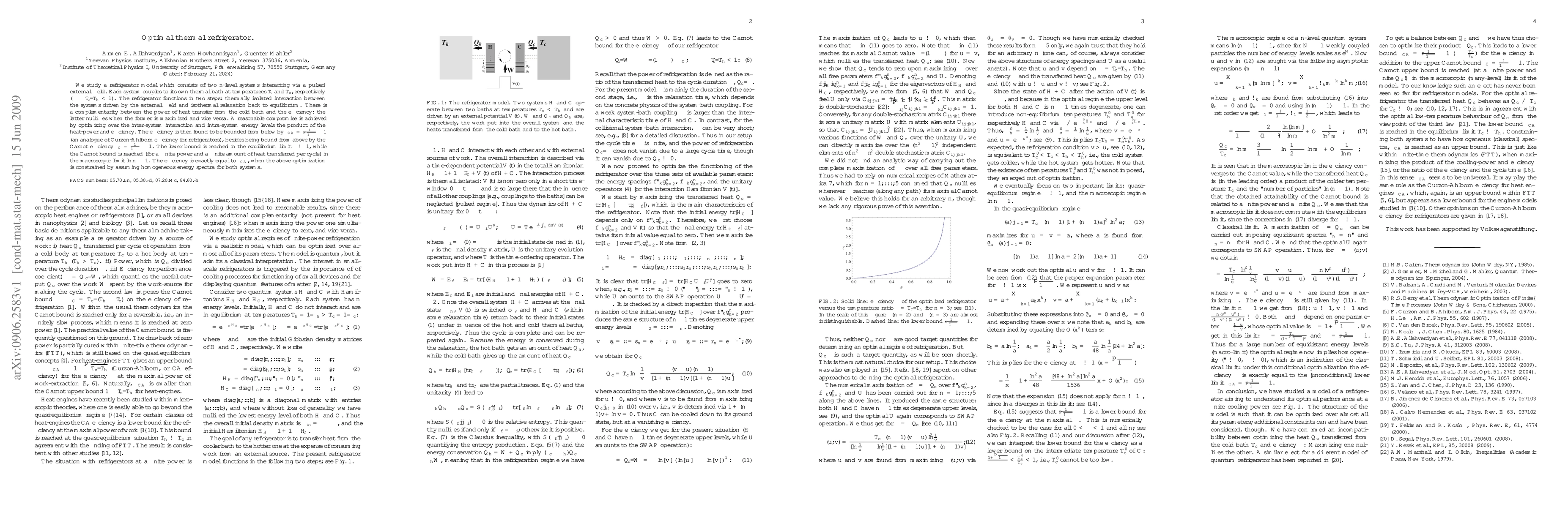 The paper presents a detailed analysis of a quantum refrigerator model, identifying a trade-off between cooling power and efficiency, and deriving bounds for the refrigerator's efficiency.