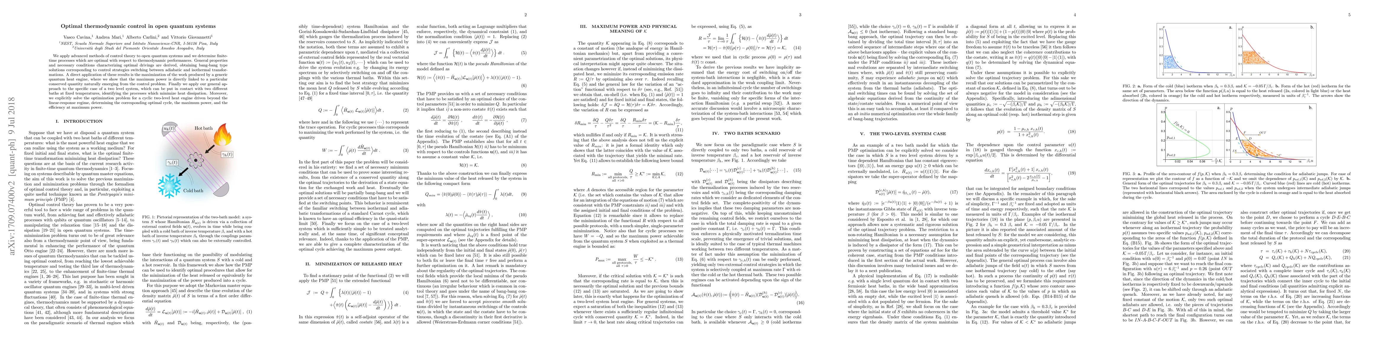 We apply advanced methods of control theory to open quantum systems and we determine finite-time processes which are optimal with respect to thermodynamic performances. General properties and necessary conditions characterizing optimal drivings are derived, obtaining bang-bang type solutions corresponding to control strategies switching between adiabatic and isothermal transformations. A direct application of these results is the maximization of the work produced by a generic quantum heat engine, where we show that the maximum power is directly linked to a particular conserved quantity naturally emerging from the control problem. Finally we apply our general approach to the specific case of a two level system, which can be put in contact with two different baths at fixed temperatures, identifying the processes which minimize heat dissipation. Moreover, we explicitly solve the optimization problem for a cyclic two-level heat engine driven beyond the linear-response regime, determining the corresponding optimal cycle, the maximum power, and the efficiency at maximum power.