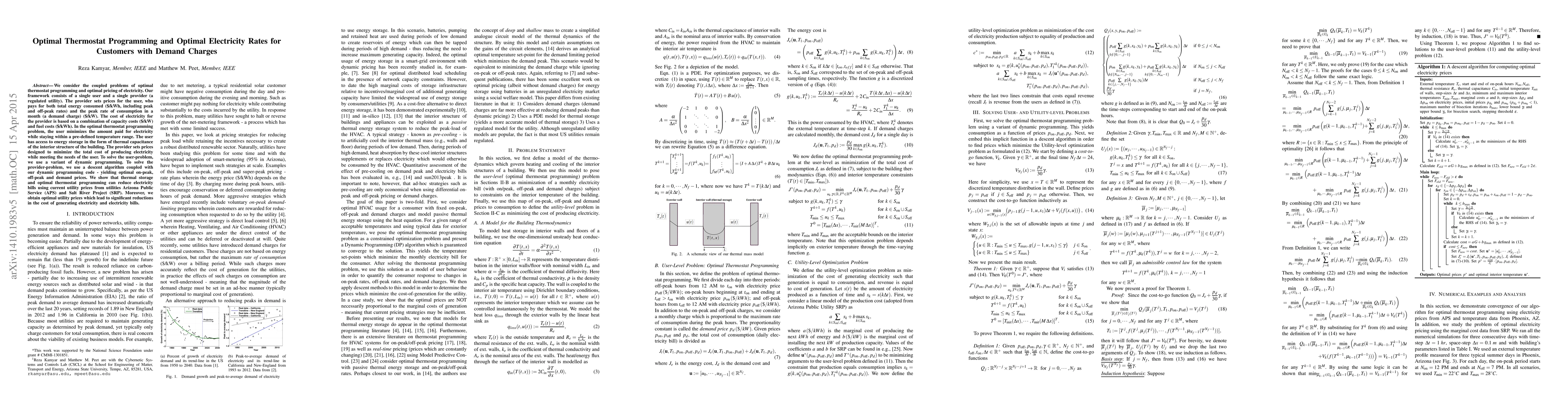 We consider the coupled problems of optimal thermostat programming and optimal pricing of electricity. Our framework consists of a single user and a single provider (a regulated utility). The provider sets prices for the user, who pays for both total energy consumed (\$/kWh, including peak and off-peak rates) and the peak rate of consumption in a month (a demand charge) (\$/kW). The cost of electricity for the provider is based on a combination of capacity costs (\$/kW) and fuel costs (\$/kWh). In the optimal thermostat programming problem, the user minimizes the amount paid for electricity while staying within a pre-defined temperature range. The user has access to energy storage in the form of thermal capacitance of the interior structure of the building. The provider sets prices designed to minimize the total cost of producing electricity while meeting the needs of the user. To solve the user-problem, we use a variant of dynamic programming. To solve the provider-problem, we use a descent algorithm coupled with our dynamic programming code - yielding optimal on-peak, off-peak and demand prices. We show that thermal storage and optimal thermostat programming can reduce electricity bills using current utility prices from utilities Arizona Public Service (APS) and Salt River Project (SRP). Moreover, we obtain optimal utility prices which lead to significant reductions in the cost of generating electricity and electricity bills.