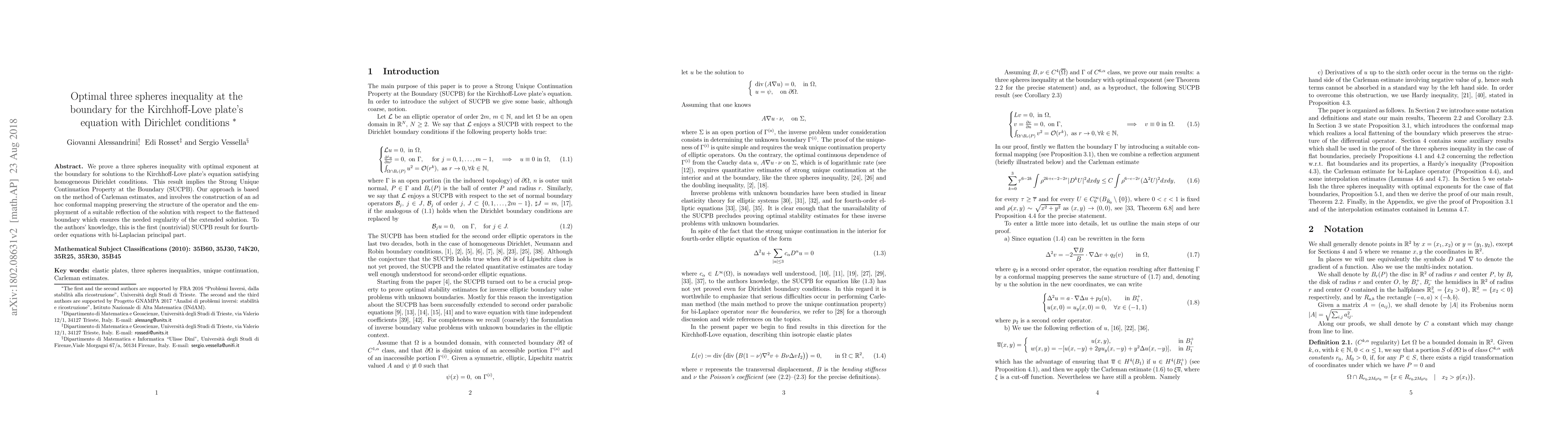 We prove a three sphere inequality with optimal exponent at the boundary for solutions to the Kirchhoff-Love plate's equation satisfying homogeneous Dirichlet conditions. This result implies the Strong Unique Continuation Property at the Boundary (SUCPB). Our approach is based on the method of Carleman estimates, and involves the construction of an ad hoc conformal mapping preserving the structure of the operator and the employment of a suitable reflection of the solution with respect to the flatten boundary which ensures the needed regularity of the extended solution. To the authors' knowledge, this is the first (nontrivial) SUCPB result for fourth-order equations with bi-Laplacian principal part.