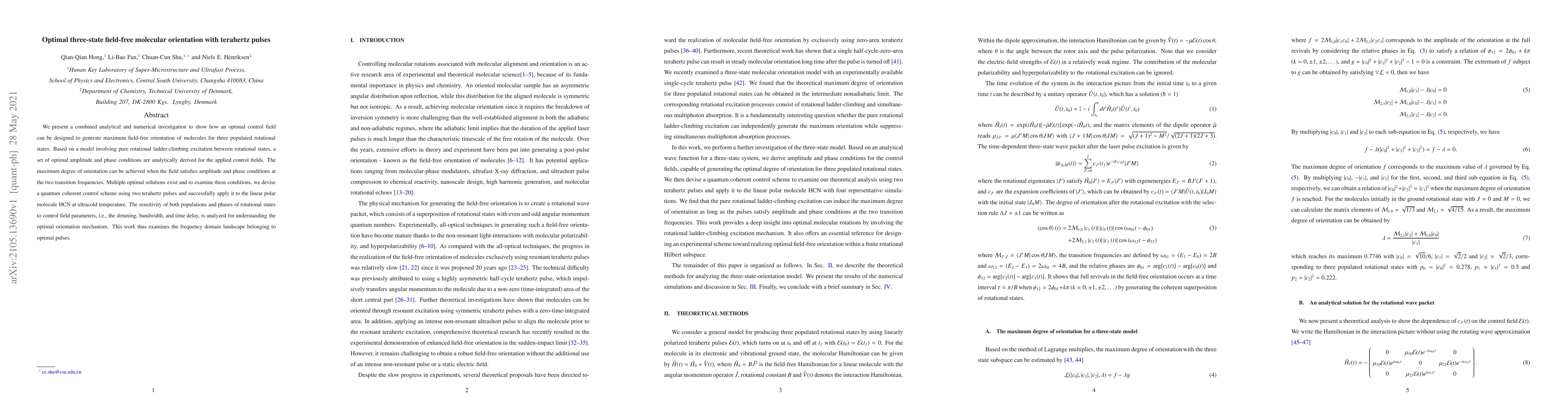 This paper investigates optimal control fields to achieve maximum field-free orientation of molecules in three rotational states using terahertz pulses. Analytical and numerical methods derive conditions for optimal amplitude and phase, and a quantum coherent control scheme is applied to HCN, demonstrating the sensitivity of rotational state populations and phases to control parameters.