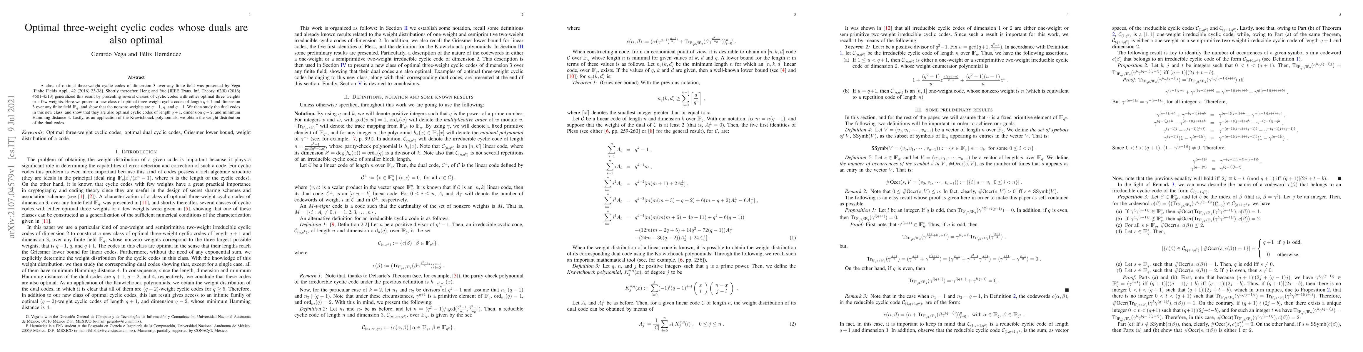 A class of optimal three-weight cyclic codes of dimension 3 over any finite field was presented by Vega [Finite Fields Appl., 42 (2016) 23-38]. Shortly thereafter, Heng and Yue [IEEE Trans. Inf. Theory, 62(8) (2016) 4501-4513] generalized this result by presenting several classes of cyclic codes with either optimal three weights or a few weights. Here we present a new class of optimal three-weight cyclic codes of length $q+1$ and dimension 3 over any finite field $F_q$, and show that the nonzero weights are $q-1$, $q$, and $q+1$. We then study the dual codes in this new class, and show that they are also optimal cyclic codes of length $q+1$, dimension $q-2$, and minimum Hamming distance $4$. Lastly, as an application of the Krawtchouck polynomials, we obtain the weight distribution of the dual codes.