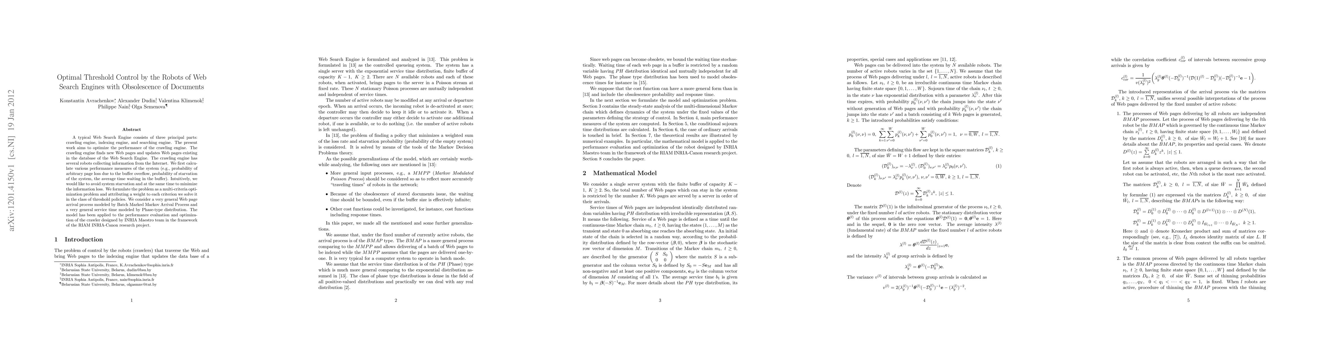 A typical web search engine consists of three principal parts: crawling engine, indexing engine, and searching engine. The present work aims to optimize the performance of the crawling engine. The crawling engine finds new web pages and updates web pages existing in the database of the web search engine. The crawling engine has several robots collecting information from the Internet. We first calculate various performance measures of the system (e.g., probability of arbitrary page loss due to the buffer overflow, probability of starvation of the system, the average time waiting in the buffer). Intuitively, we would like to avoid system starvation and at the same time to minimize the information loss. We formulate the problem as a multi-criteria optimization problem and attributing a weight to each criterion. We solve it in the class of threshold policies. We consider a very general web page arrival process modeled by Batch Marked Markov Arrival Process and a very general service time modeled by Phase-type distribution. The model has been applied to the performance evaluation and optimization of the crawler designed by INRIA Maestro team in the framework of the RIAM INRIA-Canon research project.