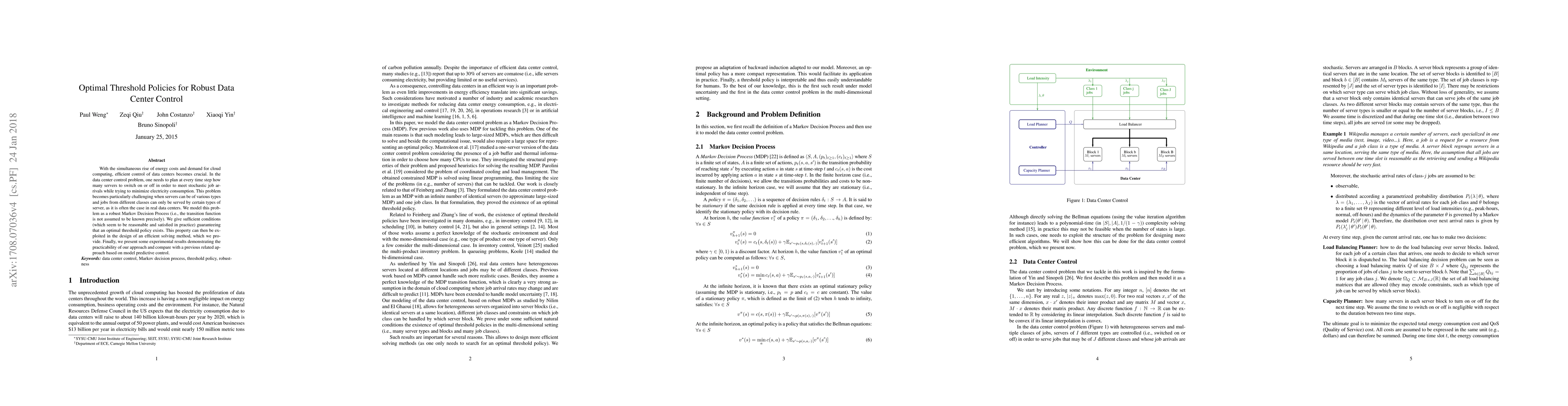 This research presents a method to efficiently control data center server usage, balancing electricity consumption and job processing. It models the problem as a robust Markov Decision Process and identifies conditions for optimal threshold policies. The paper also provides an efficient solving method and compares it with a model predictive control approach through experiments.