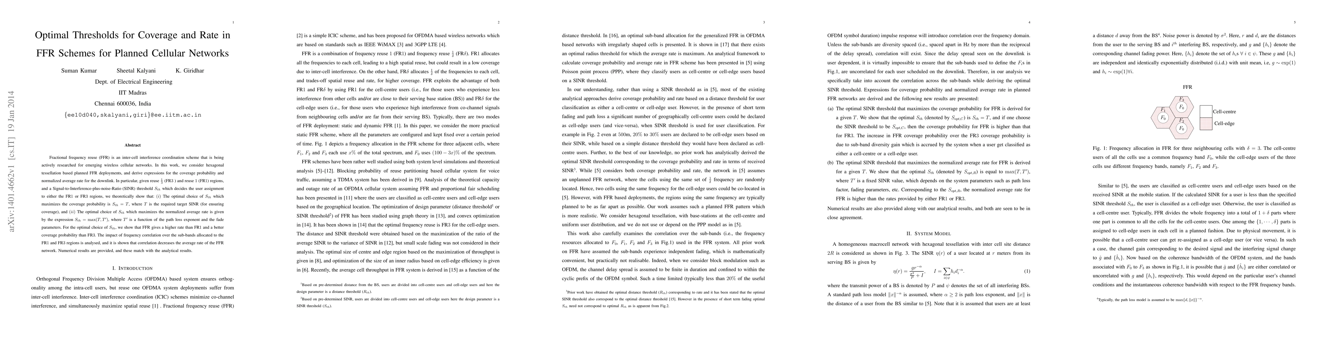 The paper optimizes thresholds for coverage and rate in fractional frequency reuse schemes, finding that FFR provides better coverage and higher rates than traditional schemes, but with decreased average rates due to frequency correlation.