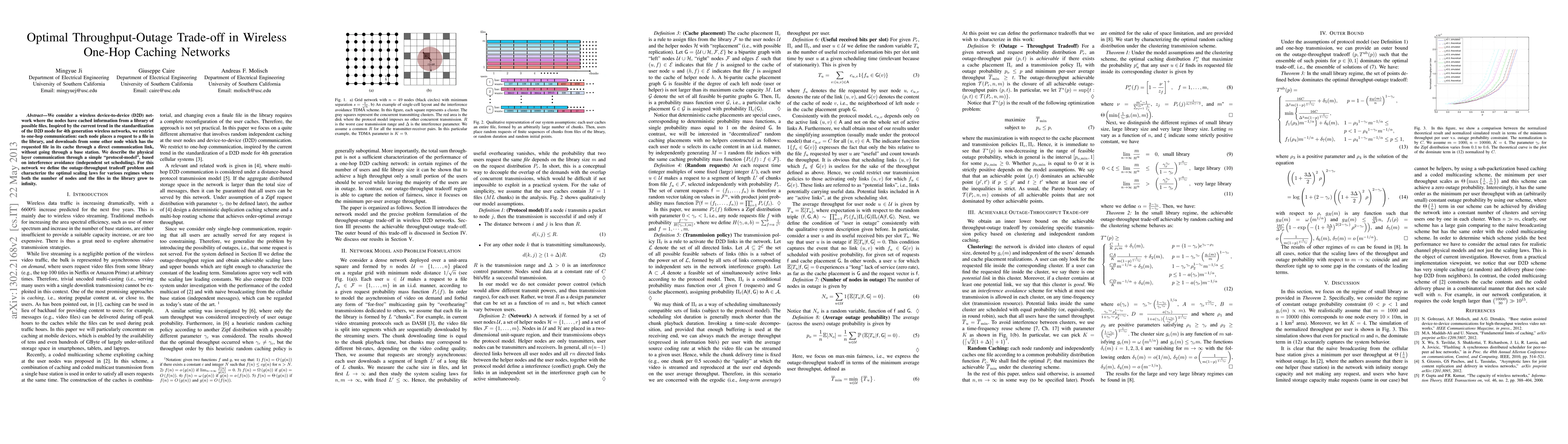 This paper investigates optimal throughput-outage trade-offs in wireless one-hop caching networks where devices directly communicate without base station intervention. It characterizes the scaling laws for the optimal trade-off under interference avoidance protocols as the number of nodes and available files grows infinitely.