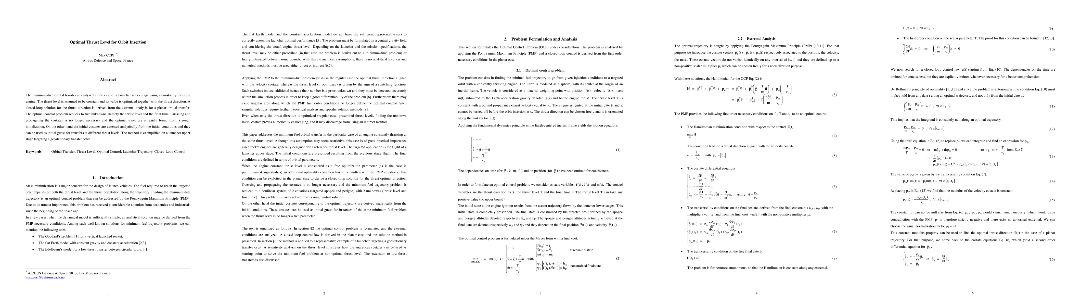 The paper optimizes thrust level for orbit insertion, reducing fuel consumption in a launcher upper stage, and introduces an analytical method to find initial costates, simplifying the control problem.