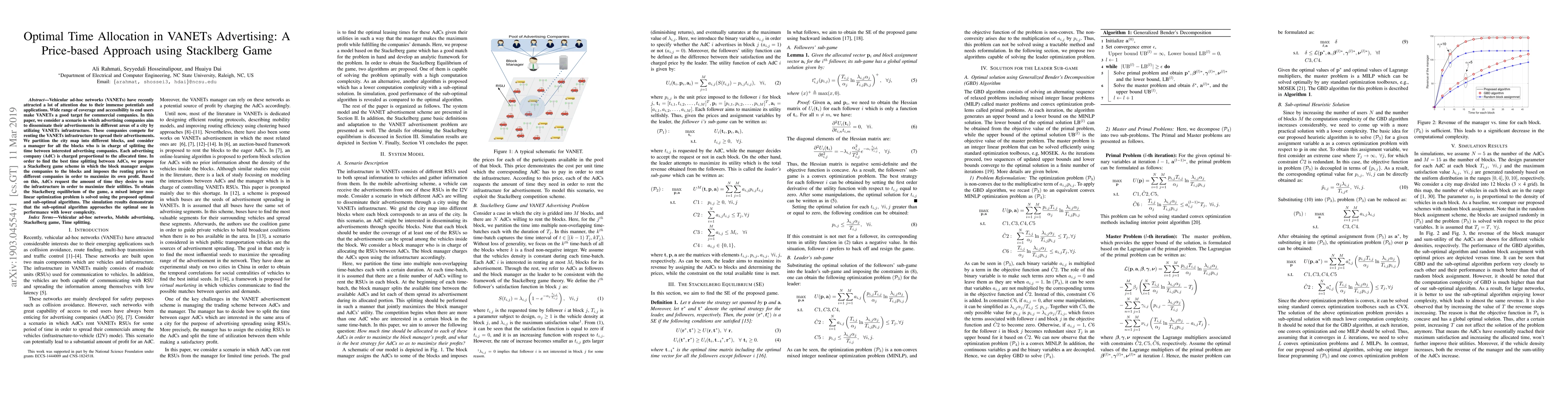 This paper proposes a Stackelberg game-based approach to optimize time allocation for advertising companies in VANETs, where a city manager sets rental prices to maximize profit while advertising companies aim to maximize their utility. The study uses mixed integer nonlinear optimization to find the Stackelberg equilibrium, showing that a sub-optimal algorithm achieves near-optimal performance with lower complexity.