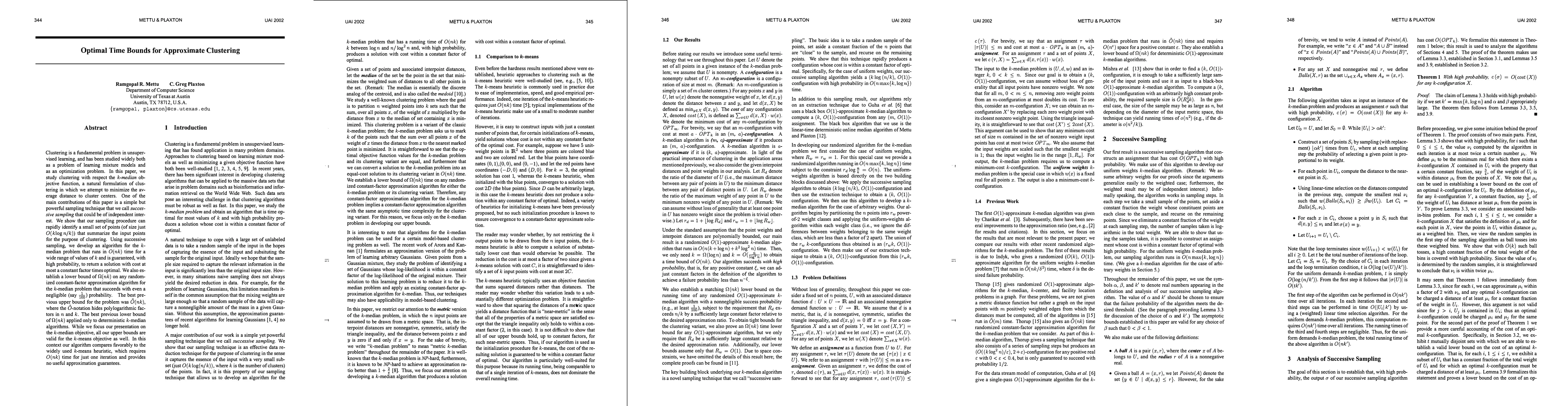 Clustering is a fundamental problem in unsupervised learning, and has been studied widely both as a problem of learning mixture models and as an optimization problem. In this paper, we study clustering with respect the emph{k-median} objective function, a natural formulation of clustering in which we attempt to minimize the average distance to cluster centers. One of the main contributions of this paper is a simple but powerful sampling technique that we call emph{successive sampling} that could be of independent interest. We show that our sampling procedure can rapidly identify a small set of points (of size just O(klog{n/k})) that summarize the input points for the purpose of clustering. Using successive sampling, we develop an algorithm for the k-median problem that runs in O(nk) time for a wide range of values of k and is guaranteed, with high probability, to return a solution with cost at most a constant factor times optimal. We also establish a lower bound of Omega(nk) on any randomized constant-factor approximation algorithm for the k-median problem that succeeds with even a negligible (say 1/100) probability. Thus we establish a tight time bound of Theta(nk) for the k-median problem for a wide range of values of k. The best previous upper bound for the problem was O(nk), where the O-notation hides polylogarithmic factors in n and k. The best previous lower bound of O(nk) applied only to deterministic k-median algorithms. While we focus our presentation on the k-median objective, all our upper bounds are valid for the k-means objective as well. In this context our algorithm compares favorably to the widely used k-means heuristic, which requires O(nk) time for just one iteration and provides no useful approximation guarantees.