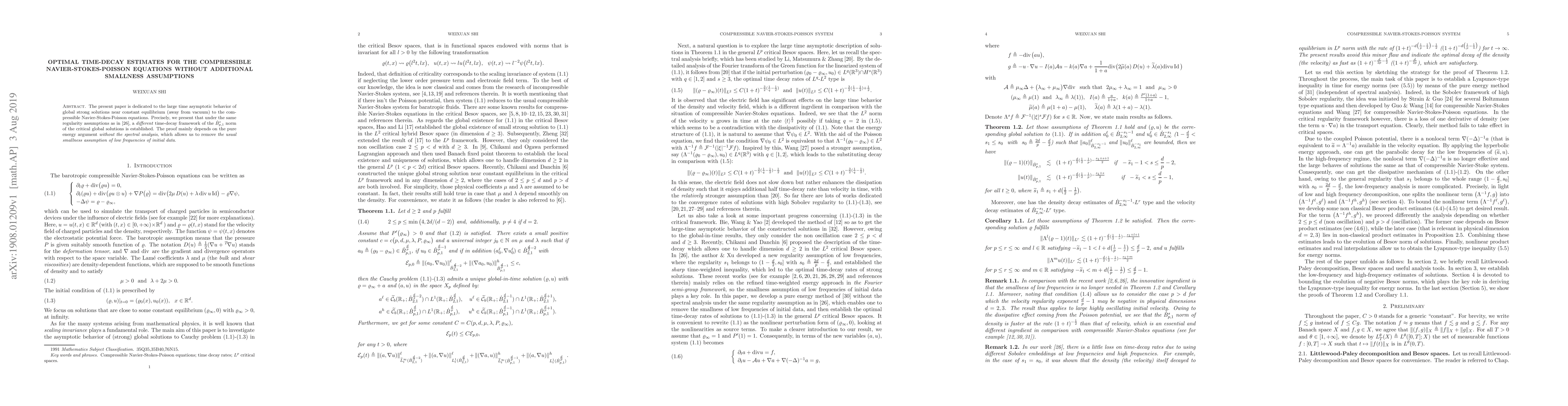 The present paper is dedicated to the large time asymptotic behavior of global strong solutions near constant equilibrium (away from vacuum) to the compressible Navier-Stokes-Poisson equations. Precisely, we present that under the same regularity assumptions as in \cite{SX2}, a \textit{different} time-decay framework of the $\dot{B}_{p,1}^{s}$ norm of the critical global solutions is established. The proof mainly depends on the pure energy argument \textit{without the spectral analysis}, which allows us to remove \textit{the usual smallness assumption of low frequencies of initial data}.