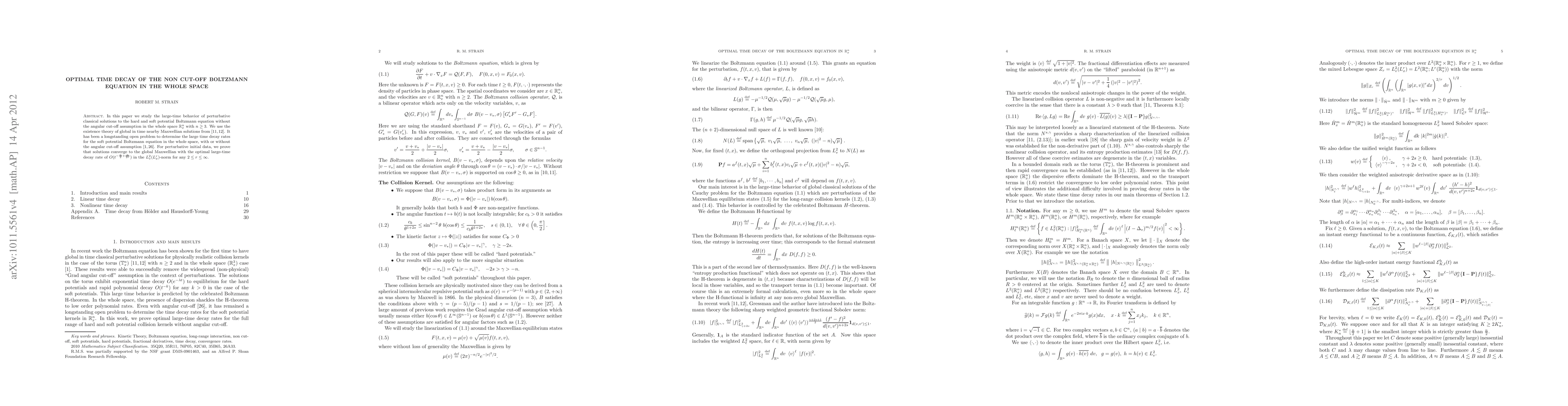 In this paper we study the large-time behavior of perturbative classical solutions to the hard and soft potential Boltzmann equation without the angular cut-off assumption in the whole space $\threed_x$ with $\DgE$. We use the existence theory of global in time nearby Maxwellian solutions from \cite{gsNonCutA,gsNonCut0}. It has been a longstanding open problem to determine the large time decay rates for the soft potential Boltzmann equation in the whole space, with or without the angular cut-off assumption \cite{MR677262,MR2847536}. For perturbative initial data, we prove that solutions converge to the global Maxwellian with the optimal large-time decay rate of $O(t^{-\frac{\Ndim}{2}+\frac{\Ndim}{2r}})$ in the $L^2_\vel(L^r_x)$-norm for any $2\leq r\leq \infty$.
