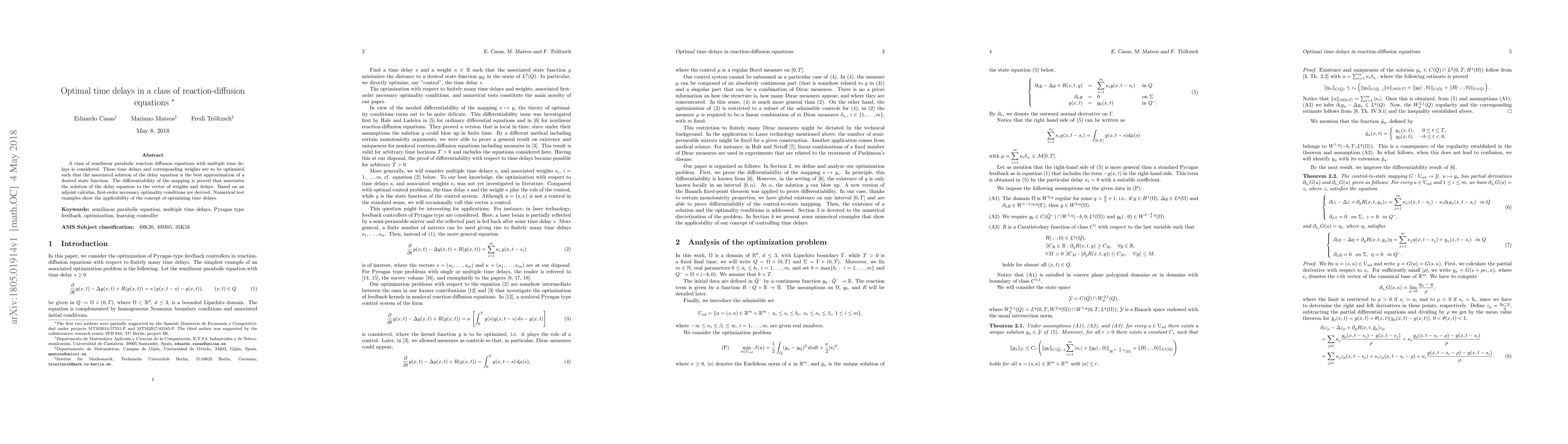 A class of semilinear parabolic reaction diffusion equations with multiple time delays is considered. These time delays and corresponding weights are to be optimized such that the associated solution of the delay equation is the best approximation of a desired state function. The differentiability of the mapping is proved that associates the solution of the delay equation to the vector of weights and delays. Based on an adjoint calculus, first-order necessary optimality conditions are derived. Numerical test examples show the applicability of the concept of optimizing time delays.