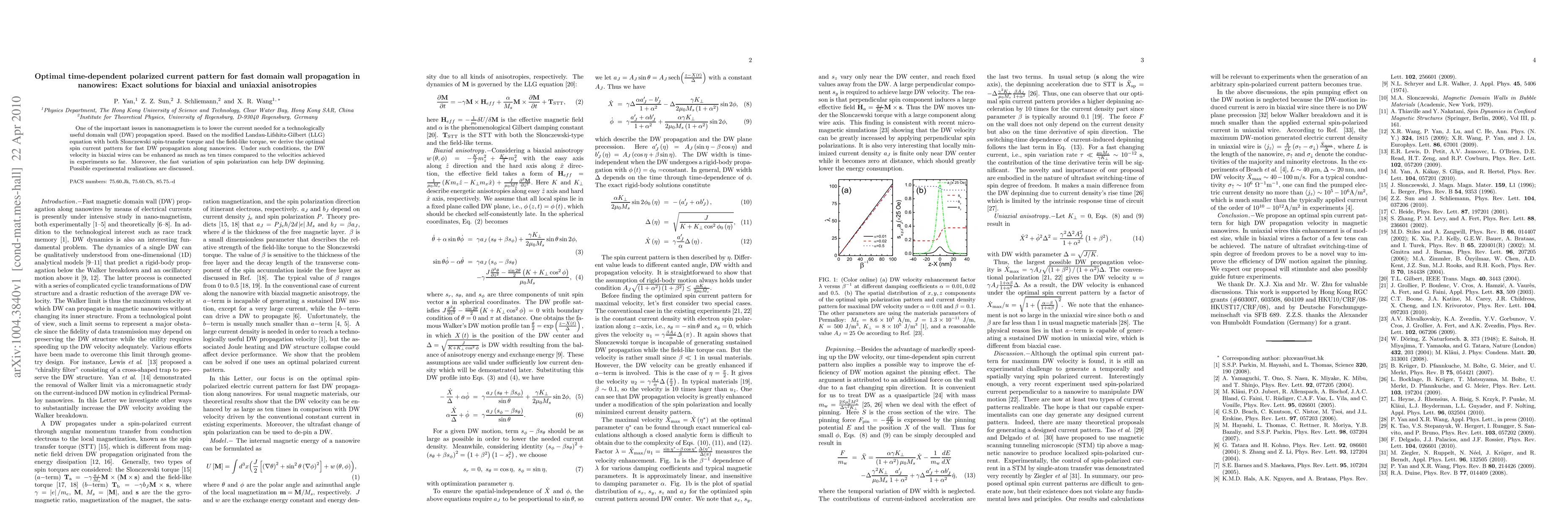 This paper derives the optimal time-dependent polarized current patterns for rapid domain wall propagation in nanowires, showing that biaxial wires can achieve up to ten times higher domain wall velocities than current experiments. The findings are based on modified Landau-Lifshitz-Gilbert equations incorporating both spin-transfer and field-like torques.