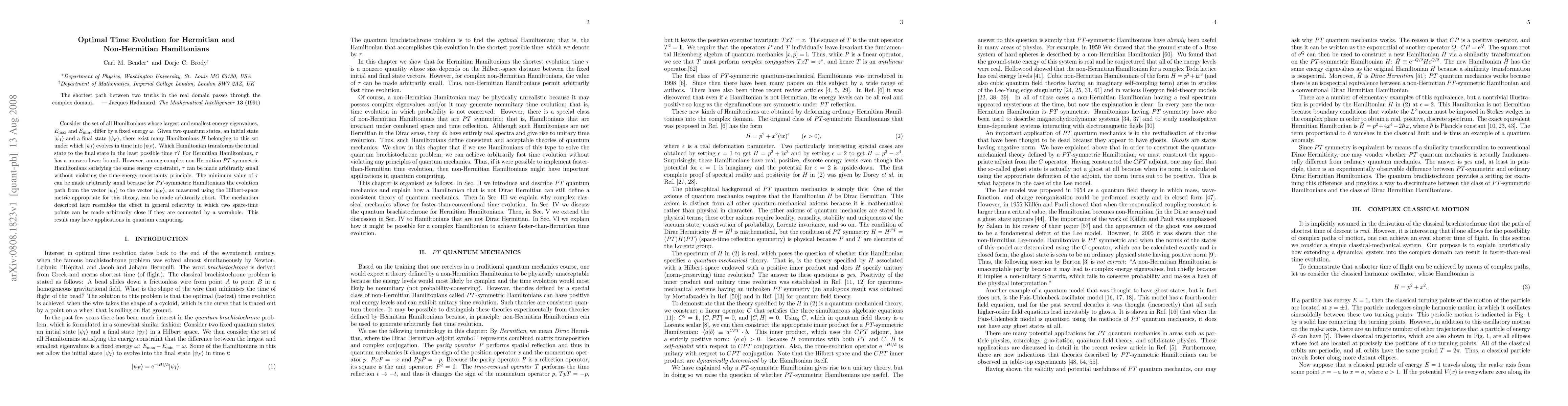 This paper investigates the optimal time evolution for quantum states under Hermitian and non-Hermitian Hamiltonians, finding that PT-symmetric non-Hermitian Hamiltonians can achieve arbitrarily short time transformations between states without violating the time-energy uncertainty principle, potentially offering applications in quantum computing.