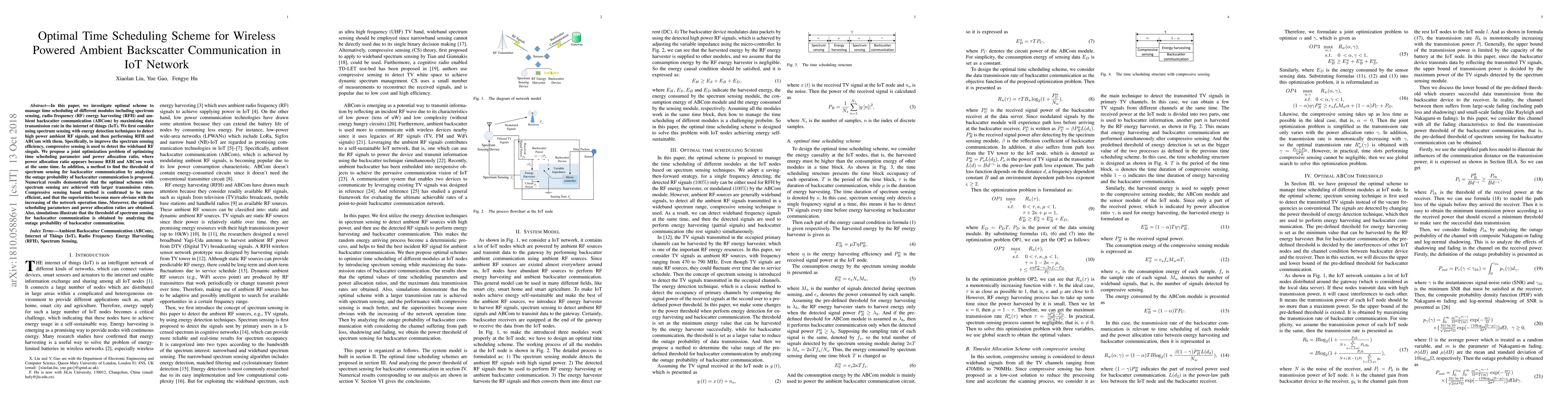 This paper proposes an optimal time scheduling scheme for wireless powered ambient backscatter communication in IoT networks, focusing on maximizing data transmission rates. It employs compressive sensing for spectrum sensing and jointly optimizes time scheduling and power allocation to enhance efficiency, demonstrating improved performance with longer network operation times.