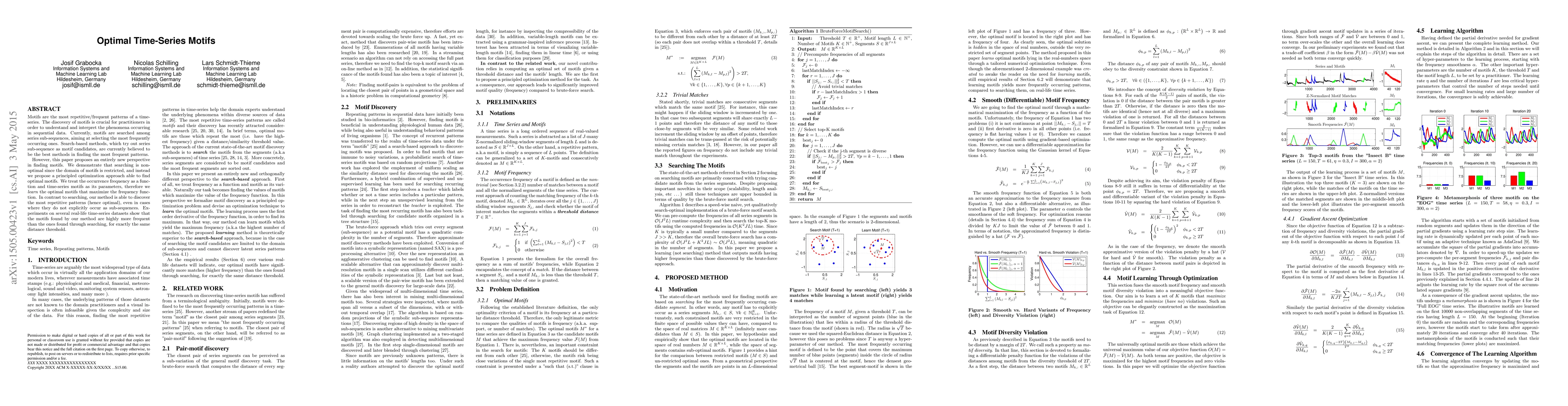 This paper introduces a novel optimization approach to discover optimal time-series motifs, contrasting with traditional search-based methods. The proposed method learns to maximize the frequency of motifs, uncovering highly repetitive patterns that may not appear as sub-sequences, outperforming search-based methods in frequency accuracy.
