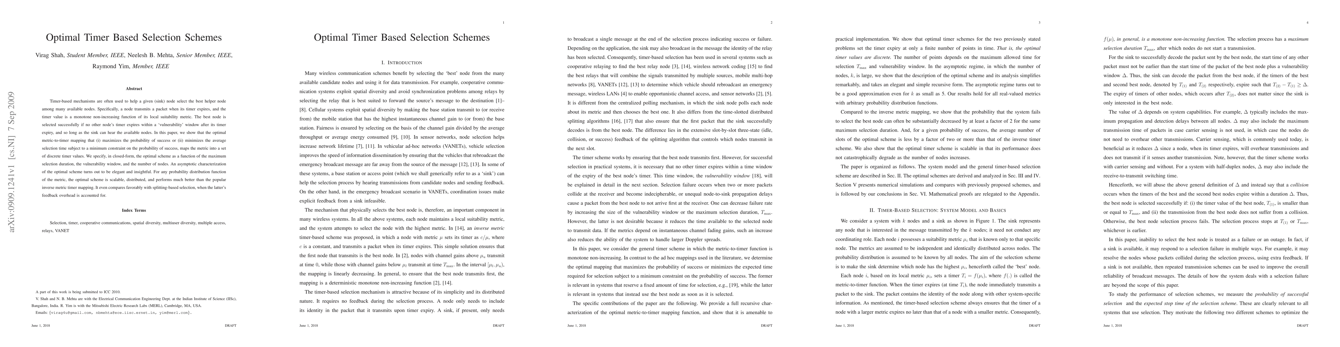 The paper presents an analysis of optimal timer-based selection schemes in wireless networks, where nodes map local suitability metrics to timer values. The optimal metric-to-timer mapping is derived for maximizing success probability or minimizing average selection time under a success probability constraint.