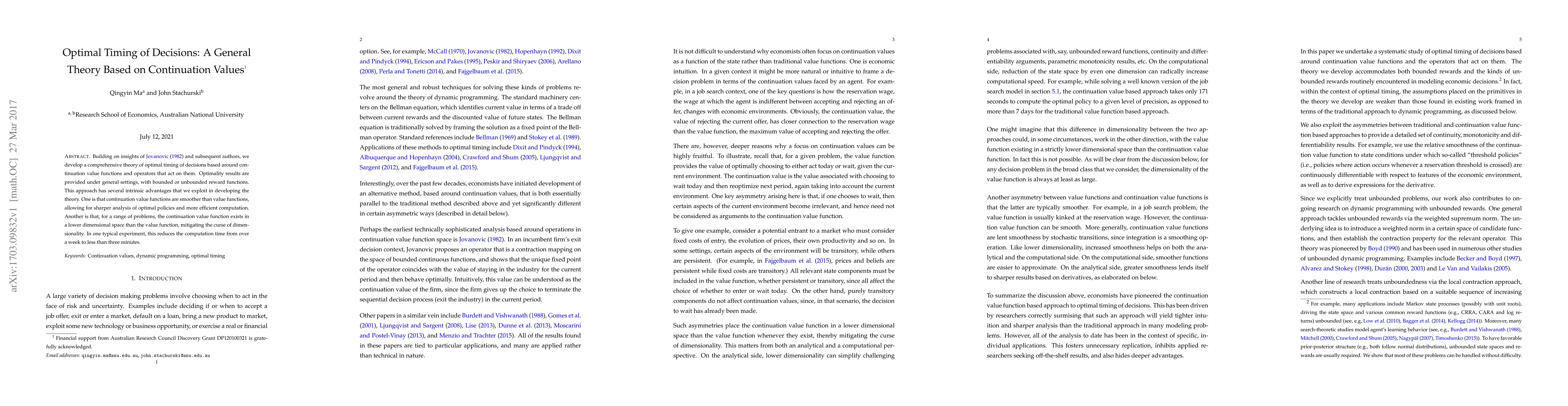 Building on insights of Jovanovic (1982) and subsequent authors, we develop a comprehensive theory of optimal timing of decisions based around continuation value functions and operators that act on them. Optimality results are provided under general settings, with bounded or unbounded reward functions. This approach has several intrinsic advantages that we exploit in developing the theory. One is that continuation value functions are smoother than value functions, allowing for sharper analysis of optimal policies and more efficient computation. Another is that, for a range of problems, the continuation value function exists in a lower dimensional space than the value function, mitigating the curse of dimensionality. In one typical experiment, this reduces the computation time from over a week to less than three minutes.