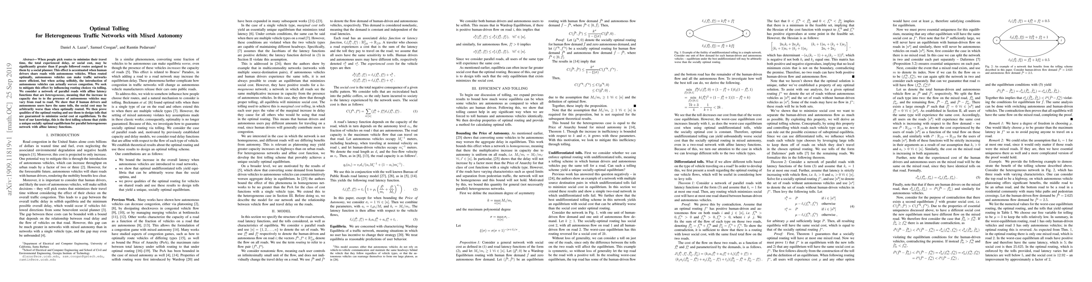 When people pick routes to minimize their travel time, the total experienced delay, or social cost, may be significantly greater than if people followed routes assigned to them by a social planner. This effect is accentuated when human drivers share roads with autonomous vehicles. When routed optimally, autonomous vehicles can make traffic networks more efficient, but when acting selfishly, the introduction of autonomous vehicles can actually worsen congestion. We seek to mitigate this effect by influencing routing choices via tolling. We consider a network of parallel roads with affine latency functions that are heterogeneous, meaning that the increase in capacity due to to the presence of autonomous vehicles may vary from road to road. We show that if human drivers and autonomous users have the same tolls, the social cost may be arbitrarily worse than when optimally routed. We then prove qualities of the optimal routing and use them to design tolls that are guaranteed to minimize social cost at equilibrium. To the best of our knowledge, this is the first tolling scheme that yields a unique socially optimal equilibrium for parallel heterogeneous network with affine latency functions.