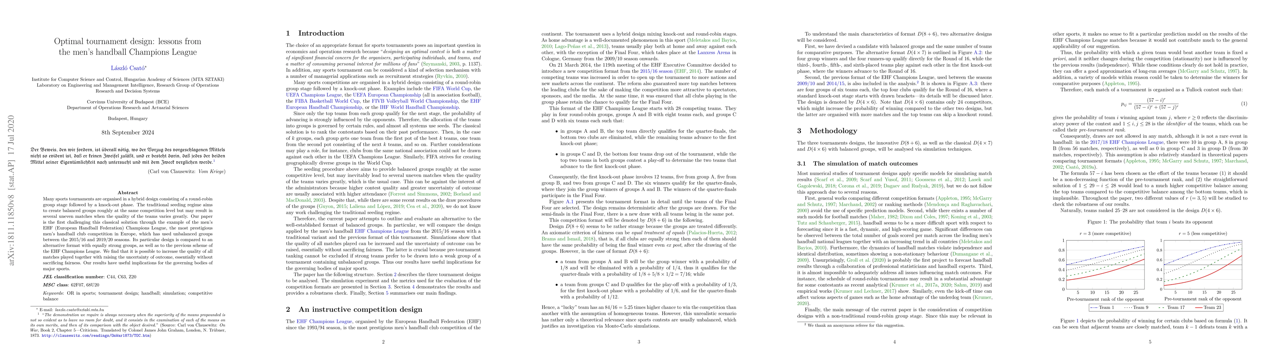 This paper examines the men's EHF Champions League handball tournament, analyzing its hybrid design featuring unbalanced groups. It finds that this design enhances match quality and outcome uncertainty while maintaining fairness, offering valuable insights for major sports tournament organizers.