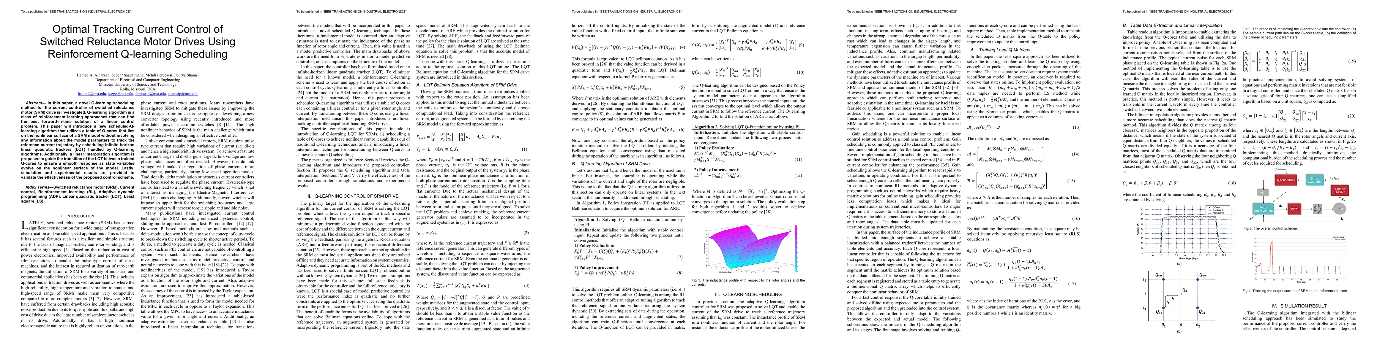 A new Q-learning scheduling method is proposed to control switched reluctance motor drives with a focus on optimal tracking current control, enabling smooth reference current trajectory tracking without requiring model parameters.