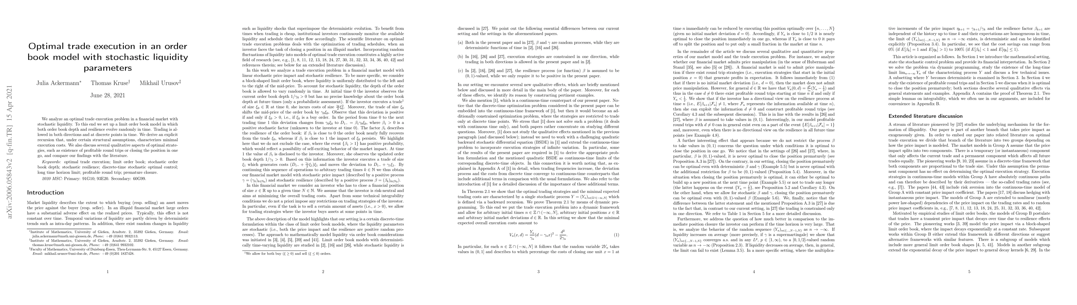 This paper develops a limit order book model with stochastic liquidity parameters to analyze optimal trade execution strategies, deriving an explicit recursion for minimal execution costs and discussing qualitative aspects of optimal strategies, including profitable round trips. Comparisons with existing literature are also presented.