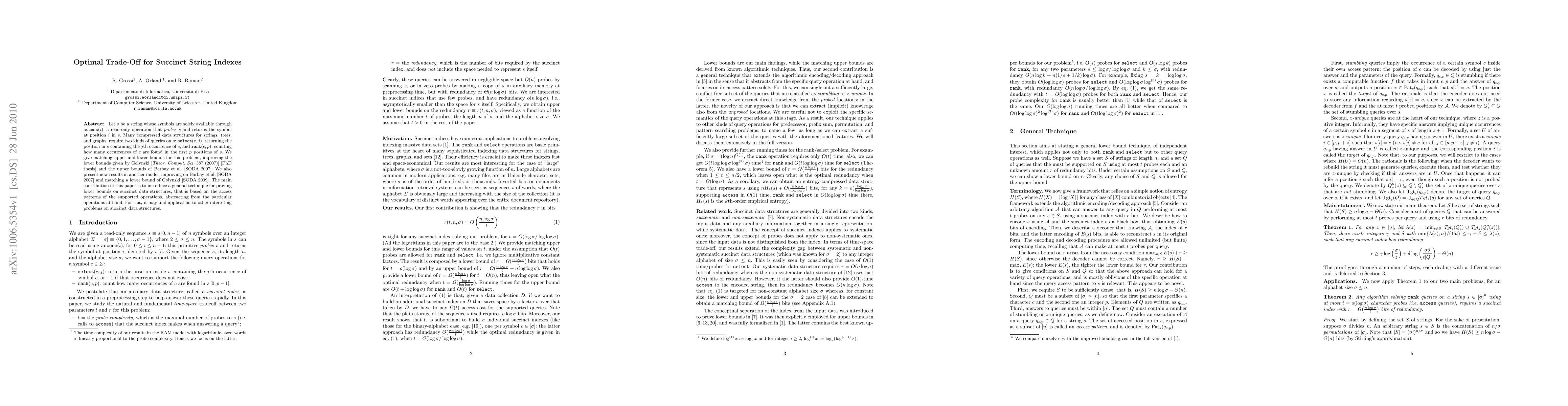 This paper establishes optimal trade-offs for succinct string indexes with bounds on select and rank queries, introducing a general technique to prove lower bounds based on access patterns.
