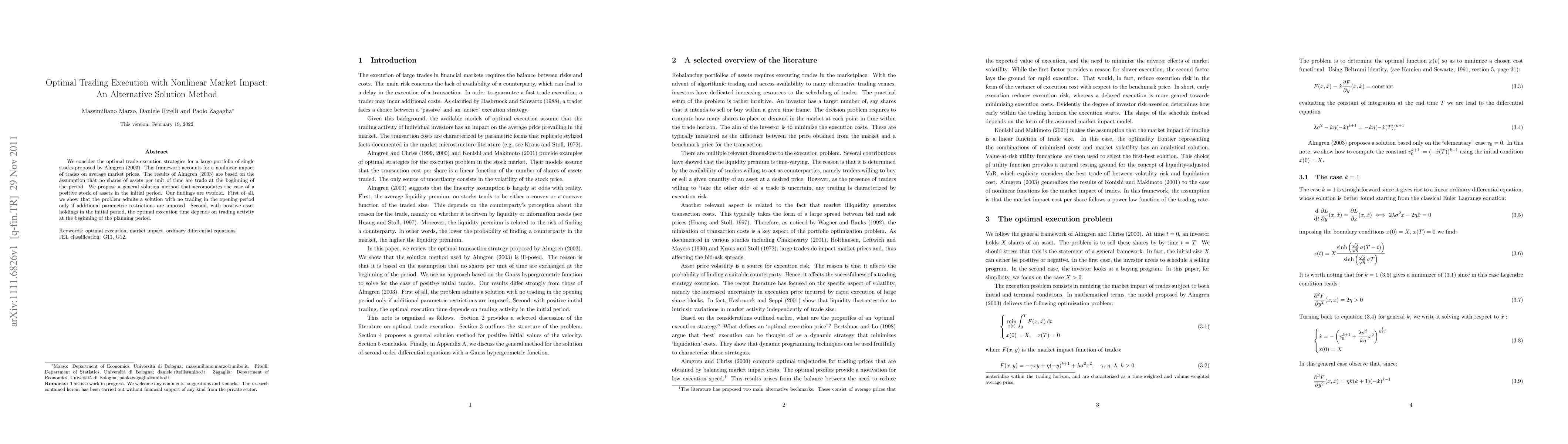 This paper proposes a new solution method for optimal trade execution strategies that considers nonlinear market impact, addressing the limitations of Almgren's (2003) model. It finds that optimal execution strategies differ when initial asset holdings are positive, and trading at the beginning of the period can affect the optimal execution time.
