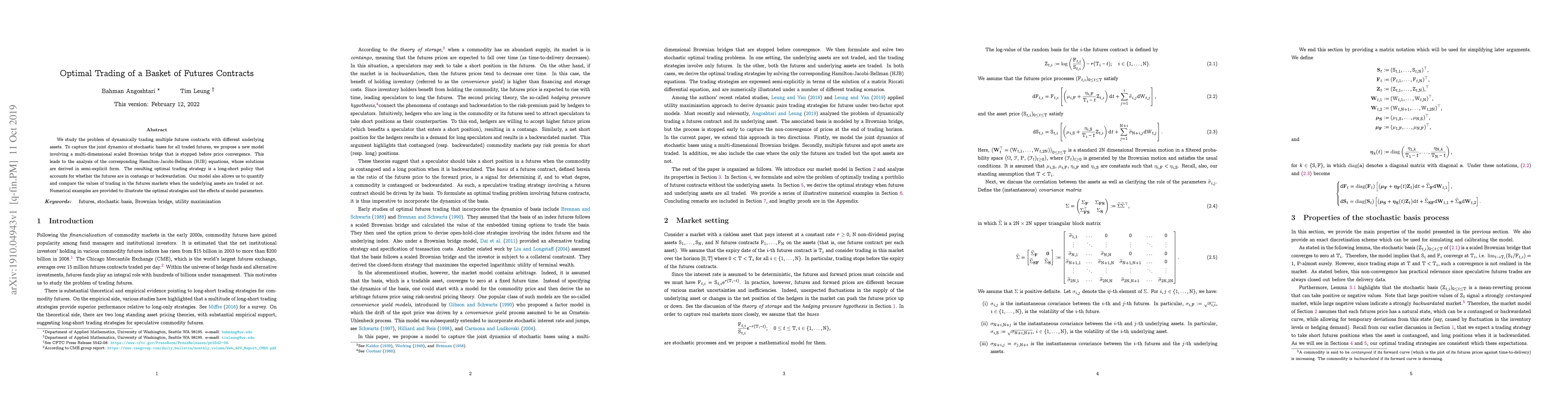 This paper proposes a new model for dynamically trading multiple futures contracts using a multi-dimensional scaled Brownian bridge, deriving optimal long-short trading strategies based on the futures' contango or backwardation, and providing numerical examples to illustrate the model's effectiveness.