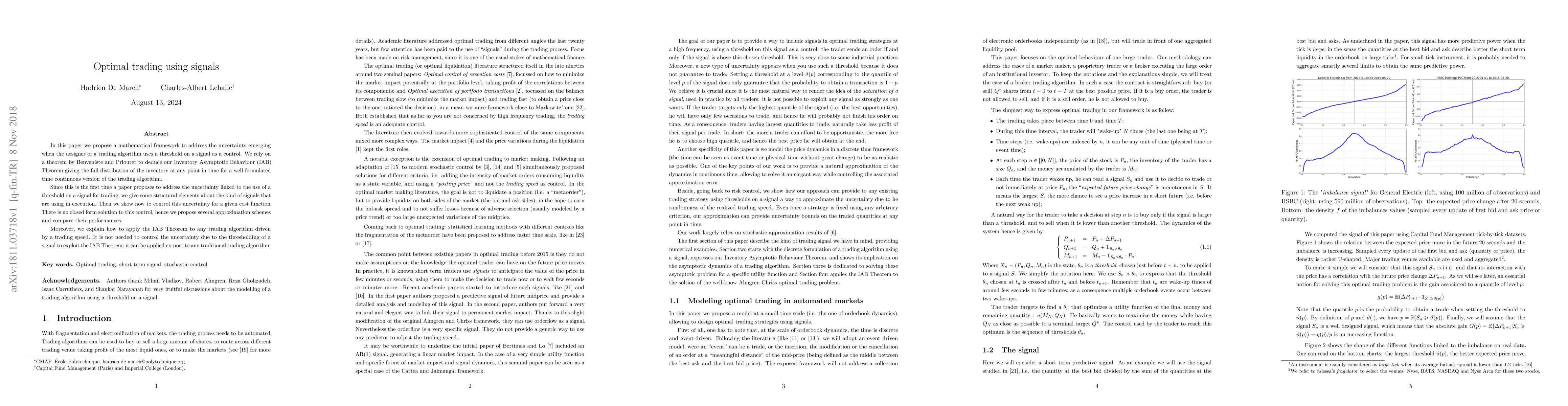 In this paper we propose a mathematical framework to address the uncertainty emergingwhen the designer of a trading algorithm uses a threshold on a signal as a control. We rely ona theorem by Benveniste and Priouret to deduce our Inventory Asymptotic Behaviour (IAB)Theorem giving the full distribution of the inventory at any point in time for a well formulatedtime continuous version of the trading algorithm.Since this is the first time a paper proposes to address the uncertainty linked to the use of athreshold on a signal for trading, we give some structural elements about the kind of signals thatare using in execution. Then we show how to control this uncertainty for a given cost function.There is no closed form solution to this control, hence we propose several approximation schemesand compare their performances.Moreover, we explain how to apply the IAB Theorem to any trading algorithm drivenby a trading speed. It is not needed to control the uncertainty due to the thresholding of asignal to exploit the IAB Theorem; it can be applied ex-post to any traditional trading algorithm.