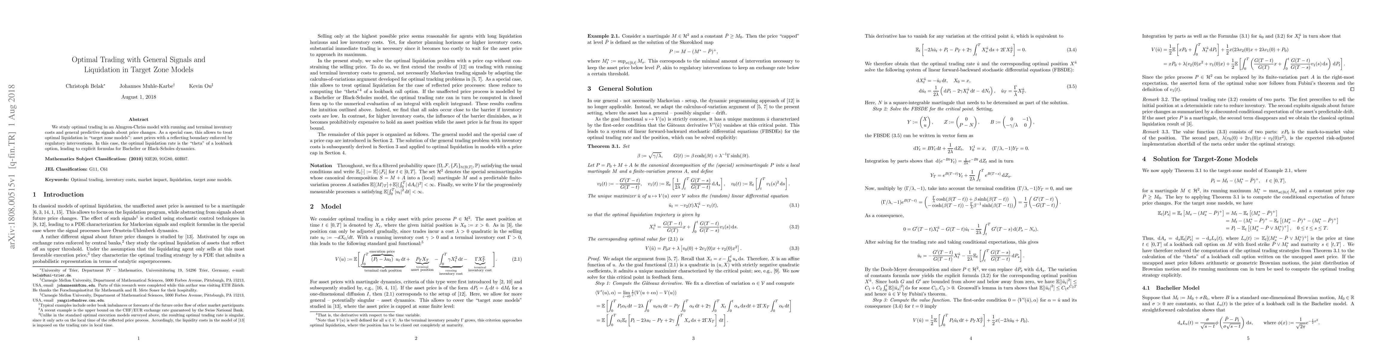 This paper explores optimal trading strategies within the Almgren-Chriss model, incorporating predictive signals and liquidation costs, and applies these insights to target zone models where regulatory boundaries influence asset prices, deriving explicit formulas for liquidation rates under Bachelier or Black-Scholes dynamics.