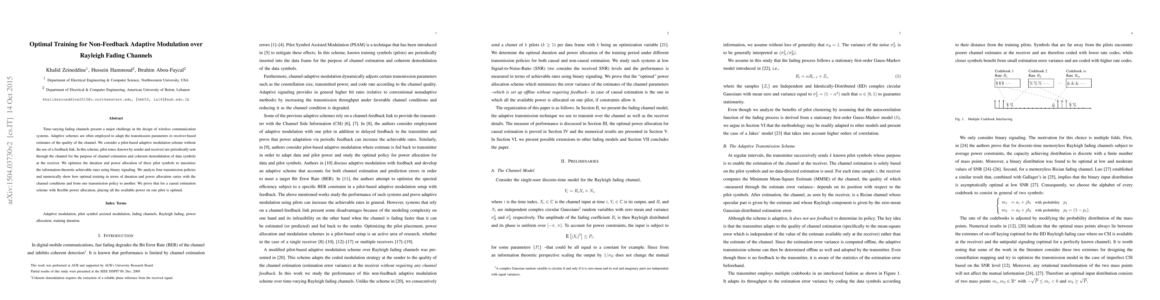 This paper investigates non-feedback adaptive Pilot Symbol Assisted Modulation (PSAM) over time-varying Rayleigh fading channels, proposing a modular method for efficient rate computation. It analyzes four transmission policies and demonstrates optimal training strategies in terms of duration and power allocation, showing that focusing all power on the last pilot symbol is optimal for causal estimation.