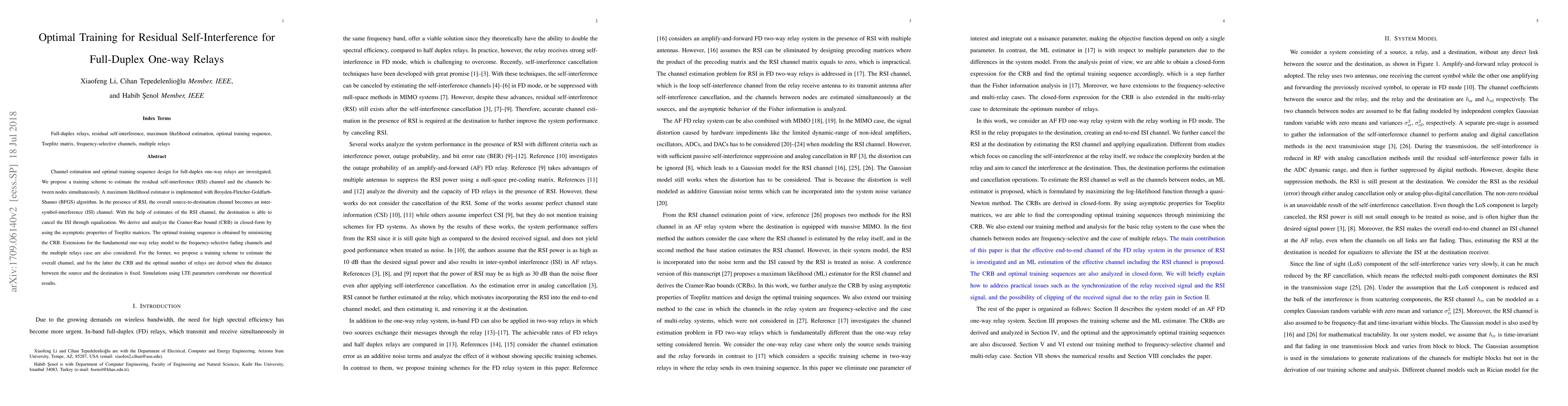 This paper investigates optimal training sequence design for full-duplex one-way relays to estimate residual self-interference and inter-channel connections. The proposed scheme uses the BFGS algorithm for maximum likelihood estimation and equalization to cancel inter-symbol interference, with theoretical results supported by LTE simulations.