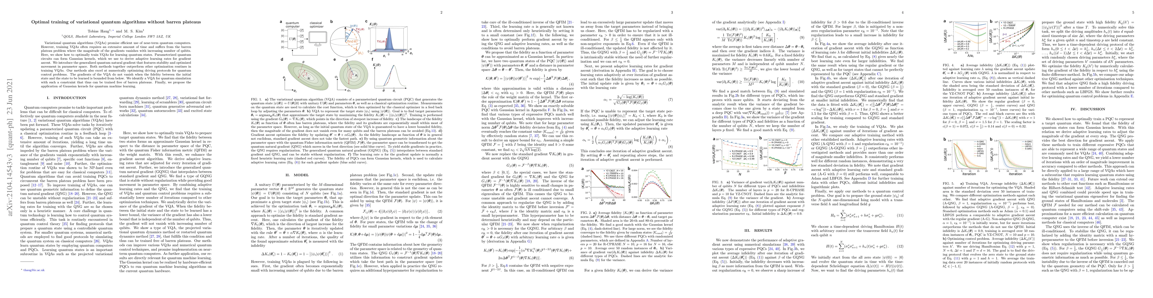 Variational quantum algorithms (VQAs) promise efficient use of near-term quantum computers. However, training VQAs often requires an extensive amount of time and suffers from the barren plateau problem where the magnitude of the gradients vanishes with increasing number of qubits. Here, we show how to optimally train VQAs for learning quantum states. Parameterized quantum circuits can form Gaussian kernels, which we use to derive adaptive learning rates for gradient ascent. We introduce the generalized quantum natural gradient that features stability and optimized movement in parameter space. Both methods together outperform other optimization routines in training VQAs. Our methods also excel at numerically optimizing driving protocols for quantum control problems. The gradients of the VQA do not vanish when the fidelity between the initial state and the state to be learned is bounded from below. We identify a VQA for quantum simulation with such a constraint that thus can be trained free of barren plateaus. Finally, we propose the application of Gaussian kernels for quantum machine learning.