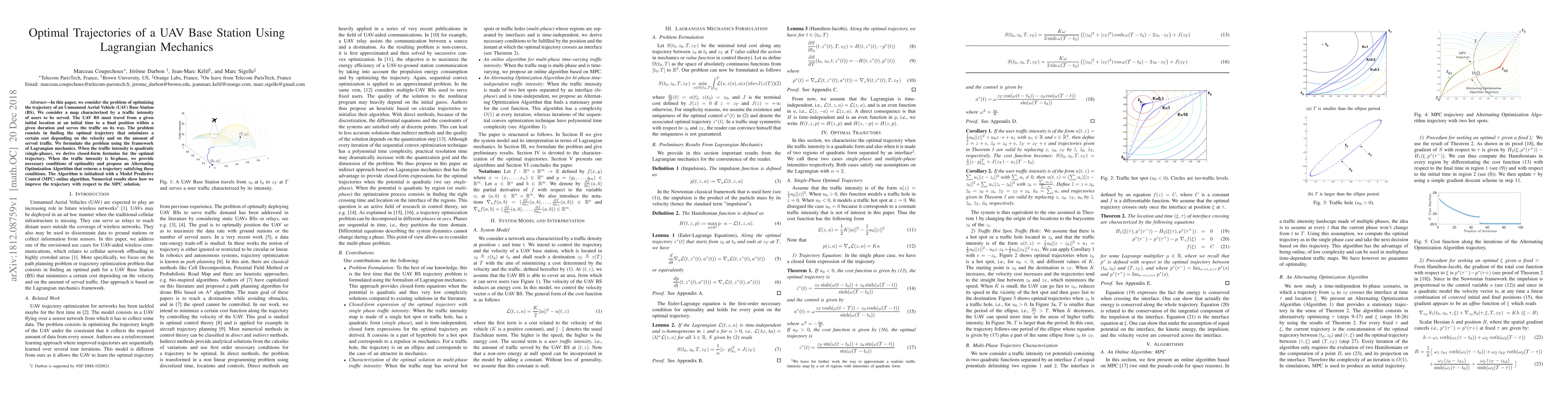 In this paper, we consider the problem of optimizing the trajectory of an Unmanned Aerial Vehicle (UAV) Base Station (BS). We consider a map characterized by a traffic intensity of users to be served. The UAV BS must travel from a given initial location at an initial time to a final position within a given duration and serves the traffic on its way. The problem consists in finding the optimal trajectory that minimizes a certain cost depending on the velocity and on the amount of served traffic. We formulate the problem using the framework of Lagrangian mechanics. When the traffic intensity is quadratic (single-phase), we derive closed-form formulas for the optimal trajectory. When the traffic intensity is bi-phase, we provide necessary conditions of optimality and propose an Alternating Optimization Algorithm that returns a trajectory satisfying these conditions. The Algorithm is initialized with a Model Predictive Control (MPC) online algorithm. Numerical results show how we improve the trajectory with respect to the MPC solution.