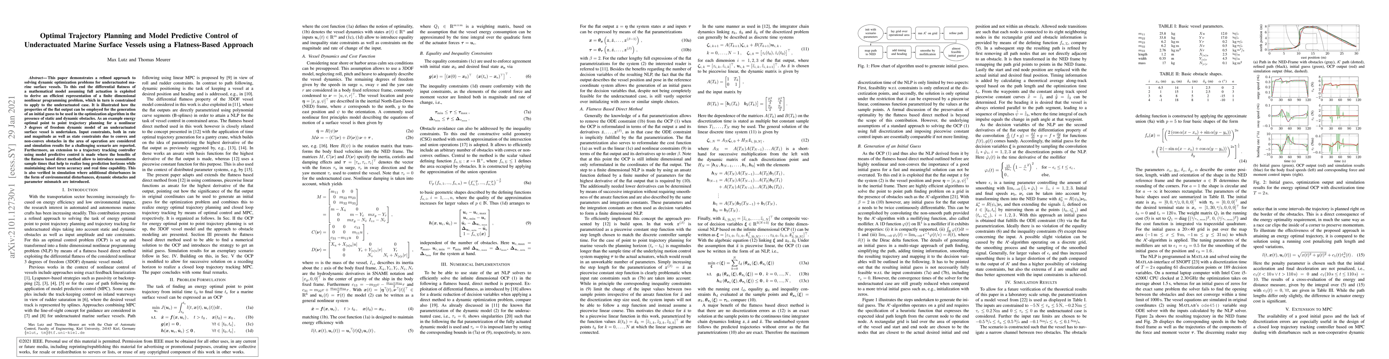 This paper presents a refined flatness-based approach for optimal trajectory planning and model predictive control of underactuated marine surface vessels, demonstrating energy-optimal path planning and trajectory tracking under various constraints and disturbances. Simulation results validate the method's effectiveness in real-time applications.