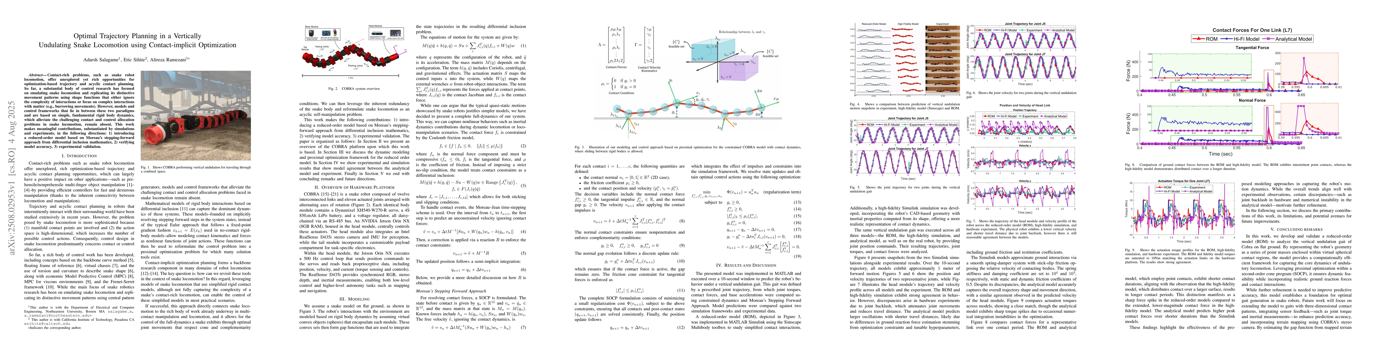 Contact-rich problems, such as snake robot locomotion, offer unexplored yet rich opportunities for optimization-based trajectory and acyclic contact planning. So far, a substantial body of control research has focused on emulating snake locomotion and replicating its distinctive movement patterns using shape functions that either ignore the complexity of interactions or focus on complex interactions with matter (e.g., burrowing movements). However, models and control frameworks that lie in between these two paradigms and are based on simple, fundamental rigid body dynamics, which alleviate the challenging contact and control allocation problems in snake locomotion, remain absent. This work makes meaningful contributions, substantiated by simulations and experiments, in the following directions: 1) introducing a reduced-order model based on Moreau's stepping-forward approach from differential inclusion mathematics, 2) verifying model accuracy, 3) experimental validation.