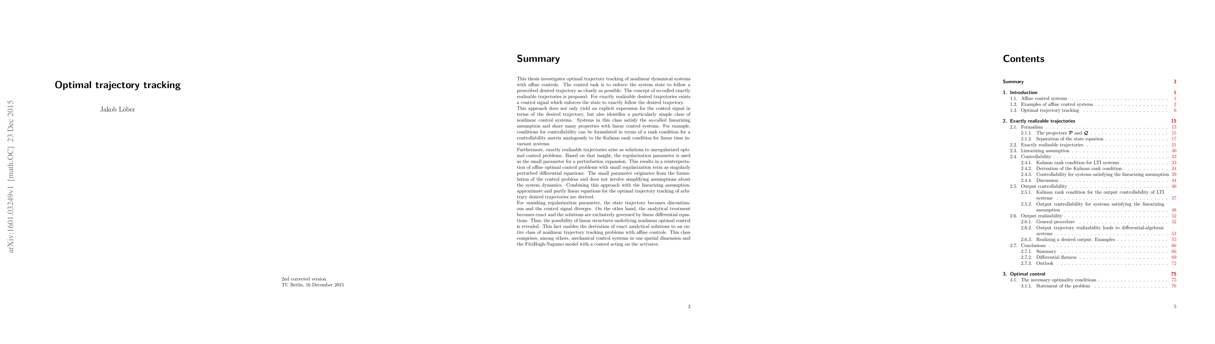 This thesis investigates optimal trajectory tracking of nonlinear dynamical systems with affine controls. The control task is to enforce the system state to follow a prescribed desired trajectory as closely as possible. The concept of so-called exactly realizable trajectories is proposed. For exactly realizable desired trajectories exists a control signal which enforces the state to exactly follow the desired trajectory. For a given affine control system, these trajectories are characterized by the so-called constraint equation. This approach does not only yield an explicit expression for the control signal in terms of the desired trajectory, but also identifies a particularly simple class of nonlinear control systems. Based on that insight, the regularization parameter is used as the small parameter for a perturbation expansion. This results in a reinterpretation of affine optimal control problems with small regularization term as singularly perturbed differential equations. The small parameter originates from the formulation of the control problem and does not involve simplifying assumptions about the system dynamics. Combining this approach with the linearizing assumption, approximate and partly linear equations for the optimal trajectory tracking of arbitrary desired trajectories are derived. For vanishing regularization parameter, the state trajectory becomes discontinuous and the control signal diverges. On the other hand, the analytical treatment becomes exact and the solutions are exclusively governed by linear differential equations. Thus, the possibility of linear structures underlying nonlinear optimal control is revealed. This fact enables the derivation of exact analytical solutions to an entire class of nonlinear trajectory tracking problems with affine controls. This class comprises mechanical control systems in one spatial dimension and the FitzHugh-Nagumo model.