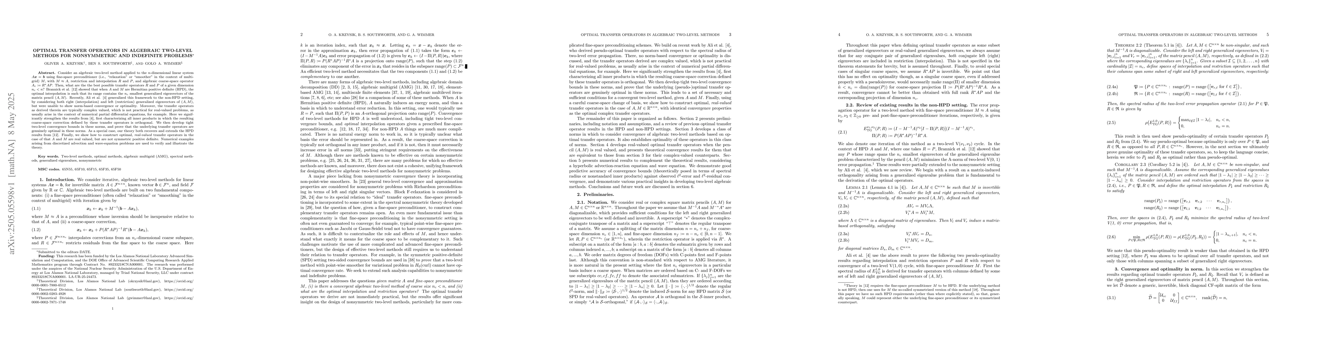 The paper presents a comprehensive analysis of optimal transfer operators in algebraic two-level methods for nonsymmetric and indefinite problems, including characterization of inner products, convergence bounds, and real-valued operator construction.