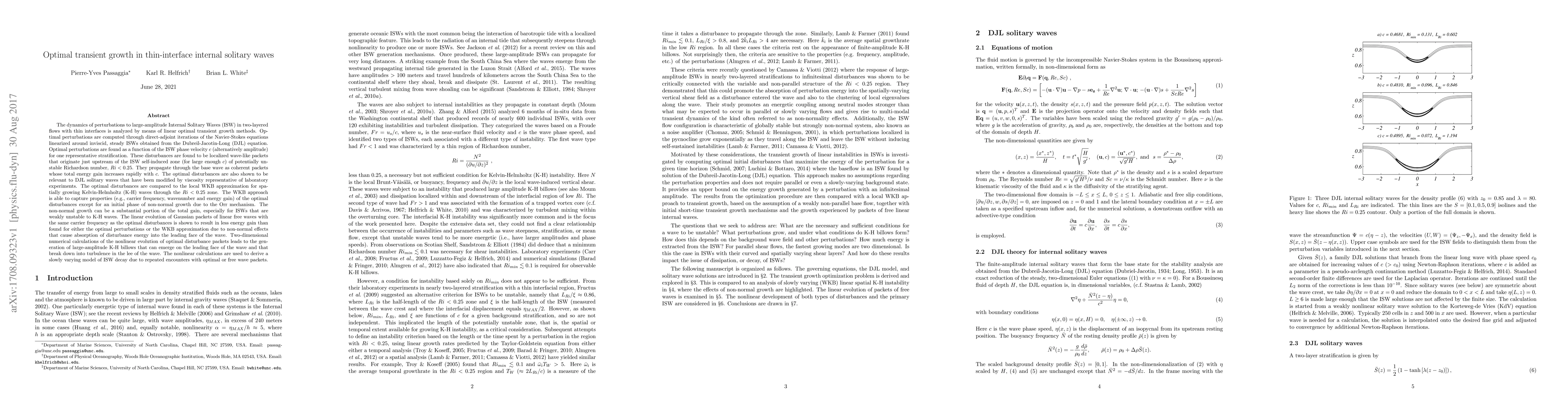 This study analyzes perturbations to large-amplitude Internal Solitary Waves (ISW) in two-layered flows using linear optimal transient growth methods. Optimal perturbations, found to be localized wave packets, originate upstream of ISWs with low Richardson number (Ri < 0.25), gaining energy rapidly with increasing phase velocity. These perturbations resemble DJL solitary waves modified by viscosity, relevant to lab experiments. The local WKB approximation for Kelvin-Helmholtz waves captures most properties of these optimal disturbances, except for initial non-normal growth due to the Orr mechanism, which can significantly contribute to total energy gain, especially for weakly unstable ISWs.