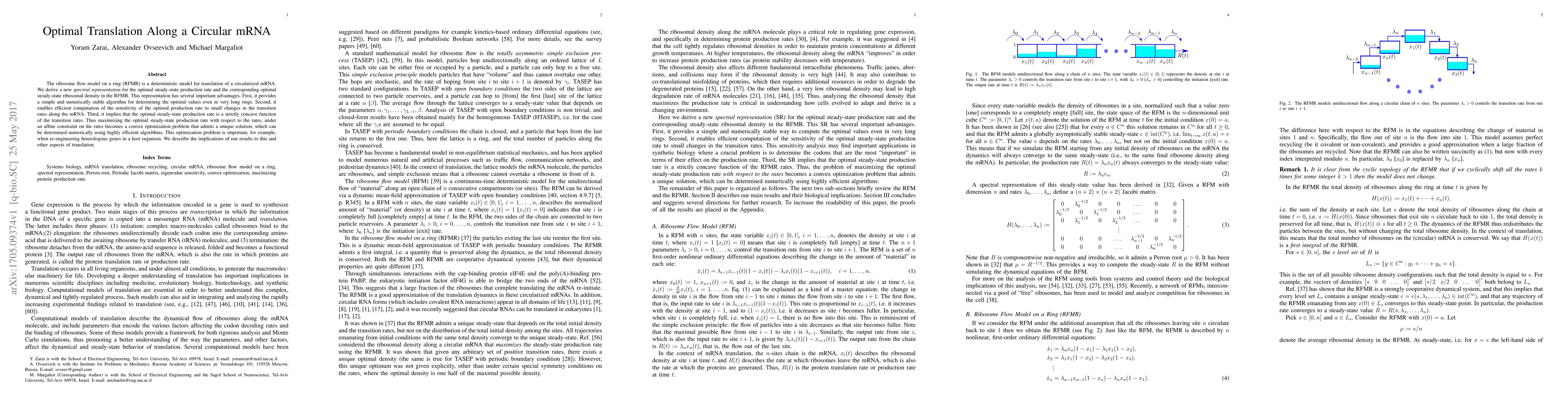 The ribosome flow model on a ring (RFMR) is a deterministic model for translation of a circularized mRNA. We derive a new spectral representation for the optimal steady-state production rate and the corresponding optimal steady-state ribosomal density in the RFMR. This representation has several important advantages. First, it provides a simple and numerically stable algorithm for determining the optimal values even in very long rings. Second, it enables efficient computation of the sensitivity of the optimal production rate to small changes in the transition rates along the mRNA. Third, it implies that the optimal steady-state production rate is a strictly concave function of the transition rates. Thus maximizing the optimal steady-state production rate with respect to the rates, under an affine constraint on the rates becomes a convex optimization problem that admits a unique solution, which can be determined numerically using highly efficient algorithms. This optimization problem is important, for example, when re-engineering heterologous genes in a host organism. We describe the implications of our results to this and other aspects of translation.