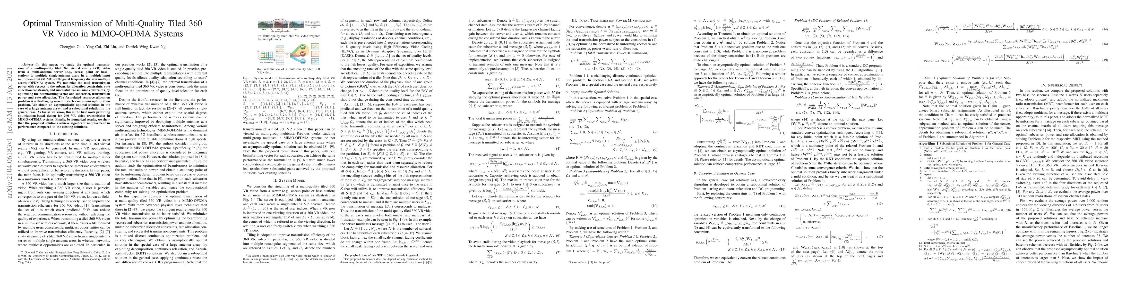 The research introduces an optimization-based approach for multi-quality tiled 360 VR video transmission in MIMO-OFDMA systems, providing asymptotically optimal and suboptimal solutions for large and general antenna array cases, respectively.