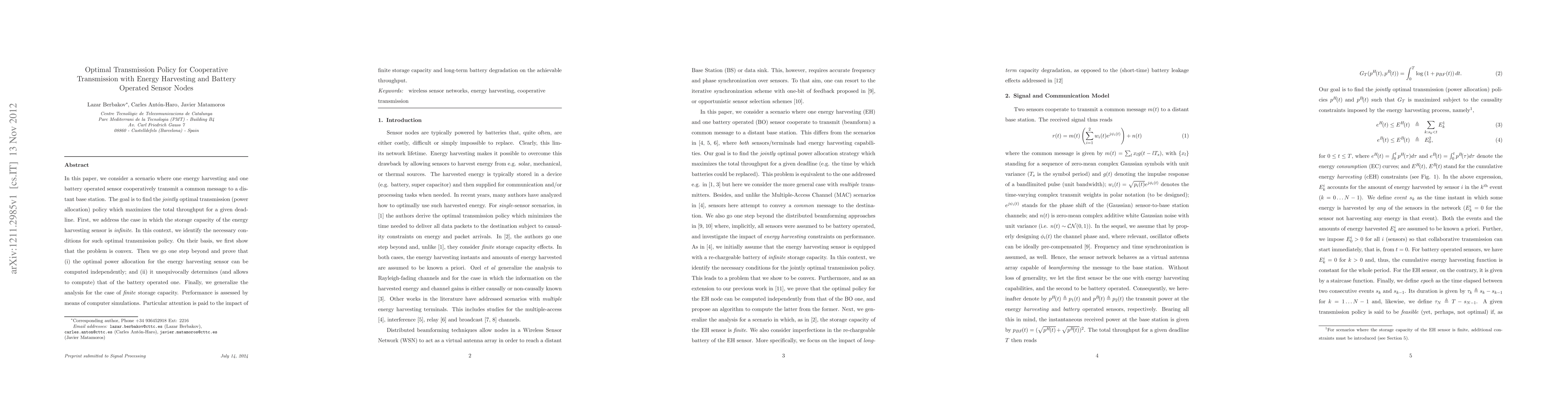 In this paper, we consider a scenario where one energy harvesting and one battery operated sensor cooperatively transmit a common message to a distant base station. The goal is to find the jointly optimal transmission (power allocation) policy which maximizes the total throughput for a given deadline. First, we address the case in which the storage capacity of the energy harvesting sensor is infinite. In this context, we identify the necessary conditions for such optimal transmission policy. On their basis, we first show that the problem is convex. Then we go one step beyond and prove that (i) the optimal power allocation for the energy harvesting sensor can be computed independently; and (ii) it unequivocally determines (and allows to compute) that of the battery operated one. Finally, we generalize the analysis for the case of finite storage capacity. Performance is assessed by means of computer simulations. Particular attention is paid to the impact of finite storage capacity and long-term battery degradation on the achievable throughput.
