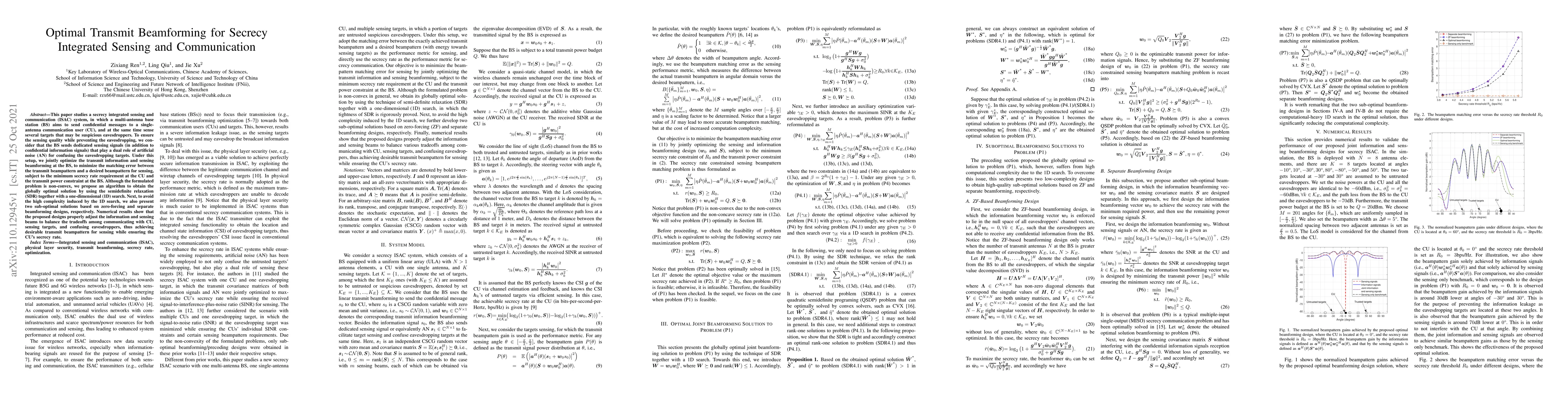 This paper optimizes transmit beamforming for a secrecy integrated sensing and communication system, where a multi-antenna base station sends confidential messages to a user while sensing potential eavesdroppers. It proposes an algorithm using semidefinite relaxation and sub-optimal solutions to balance communication and sensing while ensuring user secrecy.