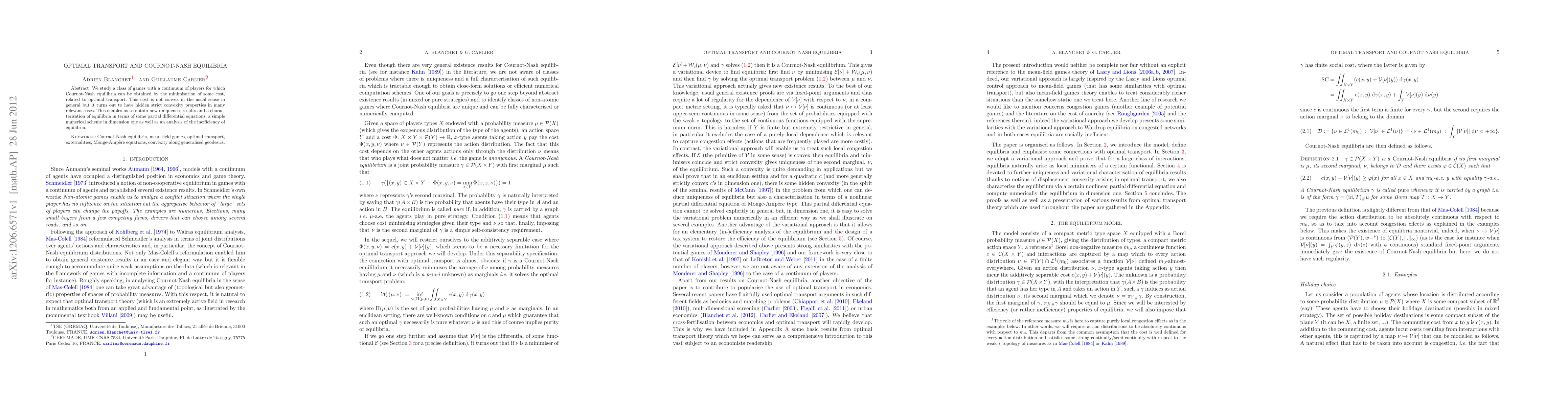 We study a class of games with a continuum of players for which Cournot-Nash equilibria can be obtained by the minimisation of some cost, related to optimal transport. This cost is not convex in the usual sense in general but it turns out to have hidden strict convexity properties in many relevant cases. This enables us to obtain new uniqueness results and a characterisation of equilibria in terms of some partial differential equations, a simple numerical scheme in dimension one as well as an analysis of the inefficiency of equilibria.